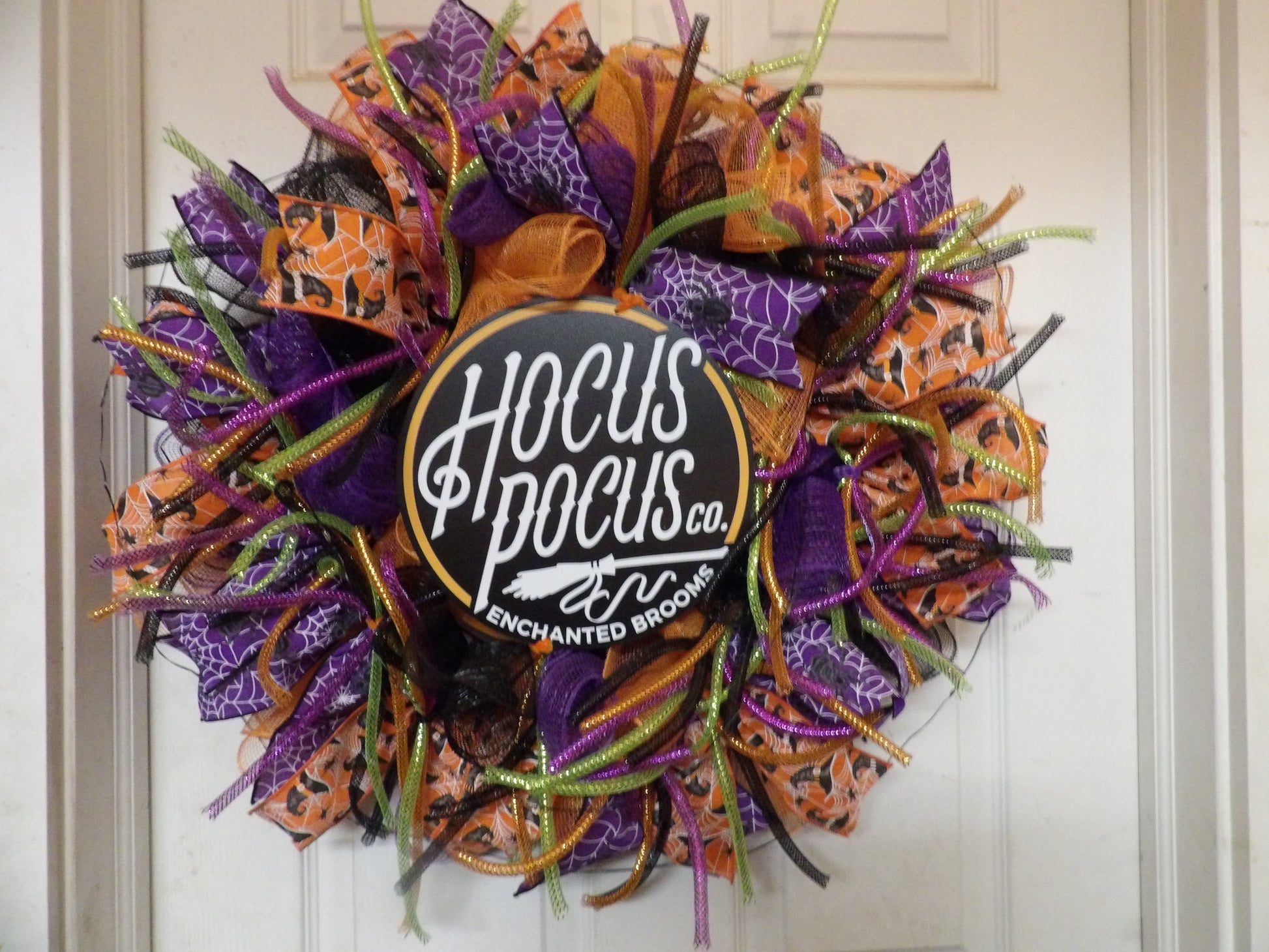 Bring a little magic and mischief to your door with this handmade Hocus Pocus Halloween wreath! Crafted in the USA, this eye-catching wreath features bold layers of orange, purple, black, and green deco mesh, playful Halloween ribbon, and a central sign that reads "Hocus Pocus Co. Enchanted Brooms". Perfect for fans of the classic movie or anyone who loves spooky season decor.
