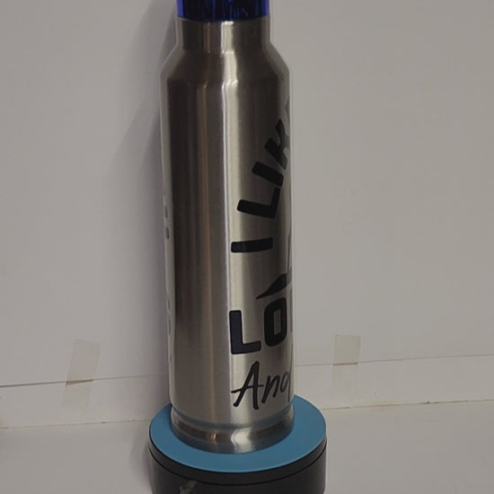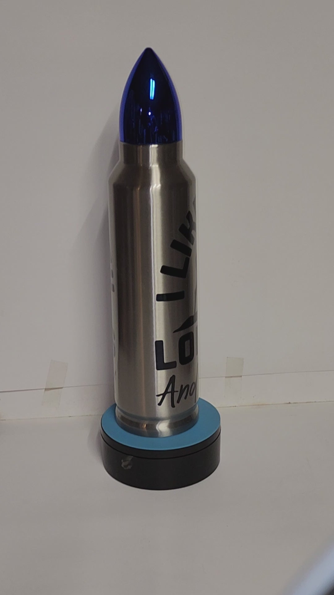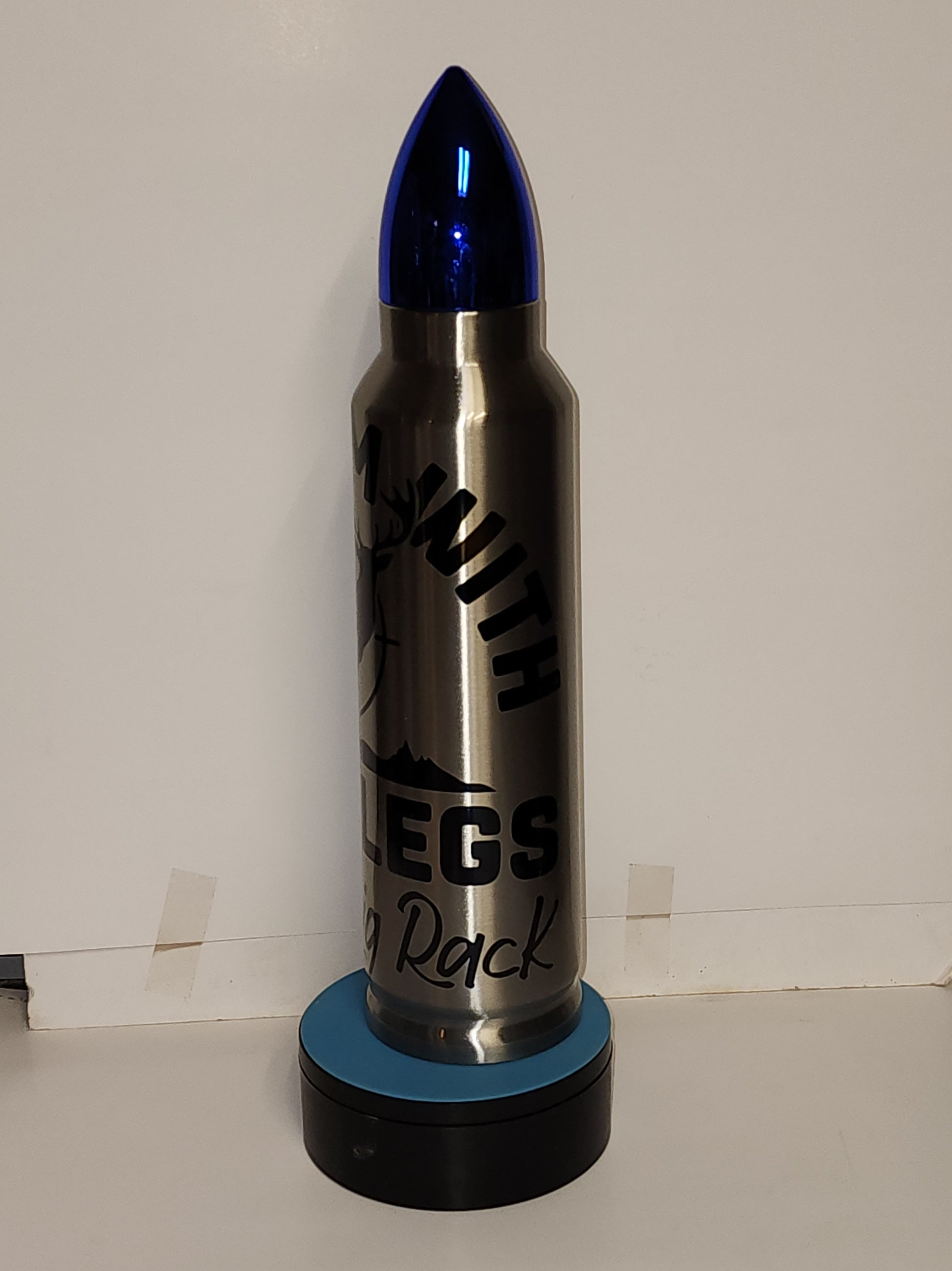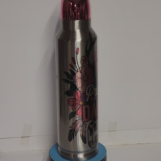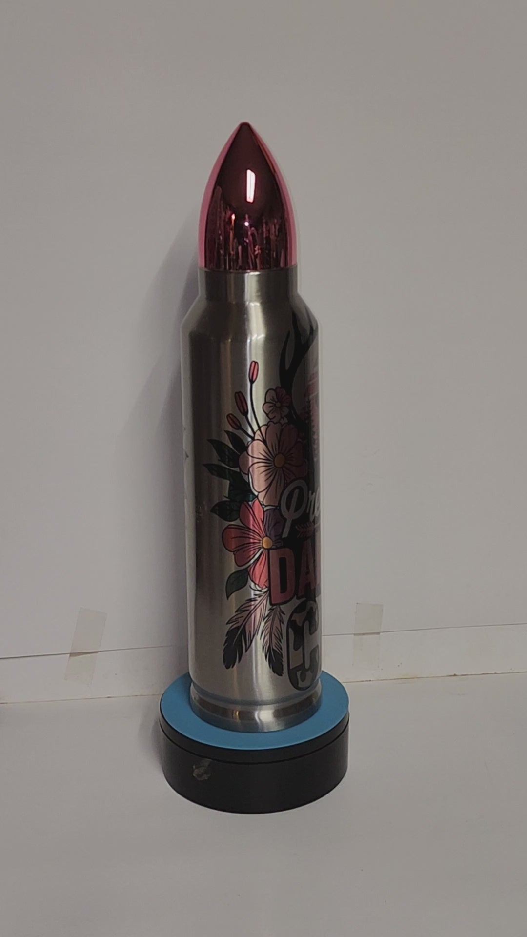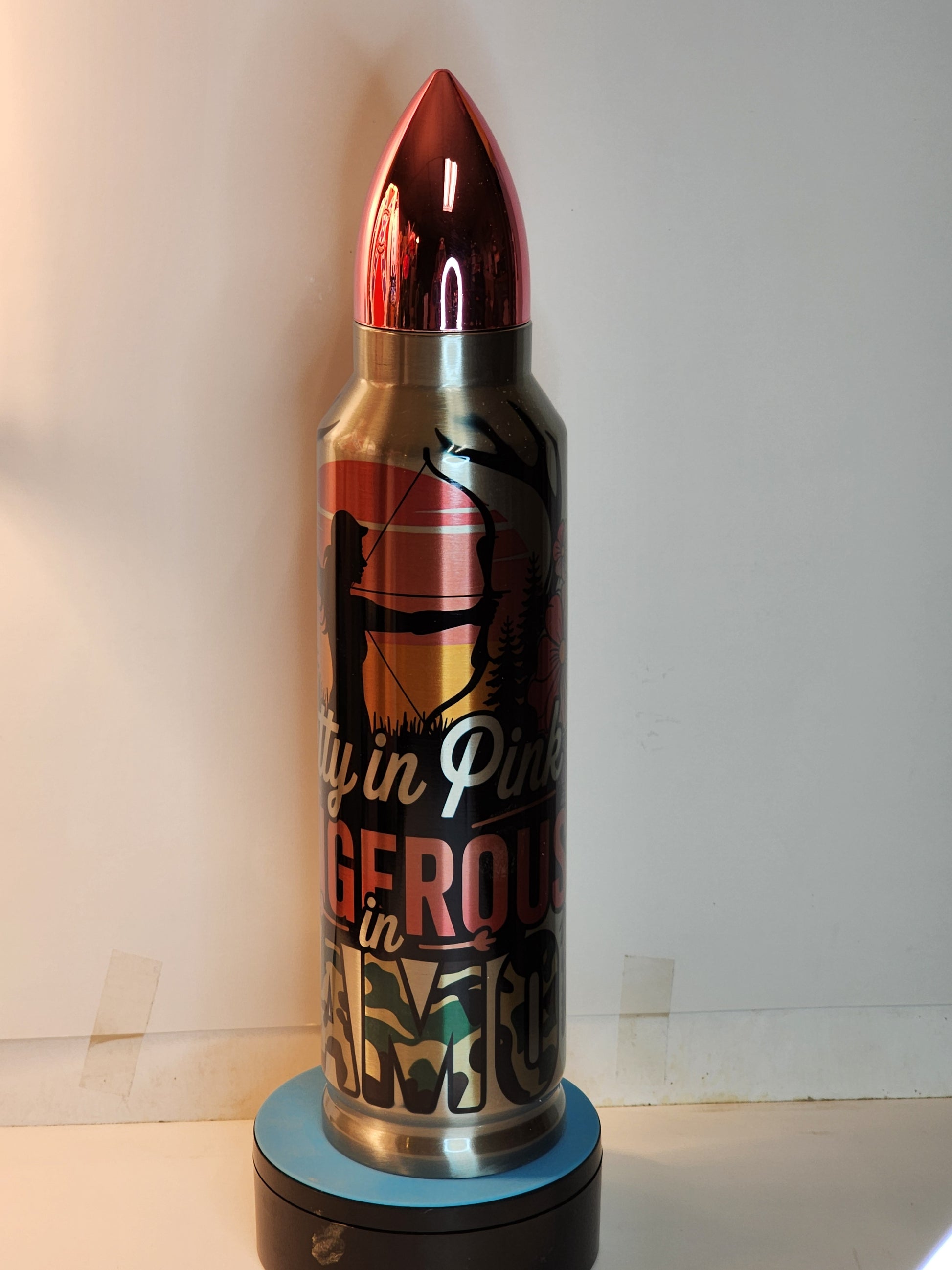 Make a bold statement on your next hunt, road trip, or workday with this 32oz Bullet-Style Stainless Steel Thermos, handcrafted in the USA. Designed for outdoorsmen and hunting enthusiasts, this thermos features a rugged metallic body, a detailed image and saying, and a striking colored bullet-shaped tip that stands out with a glossy, high-shine finish.