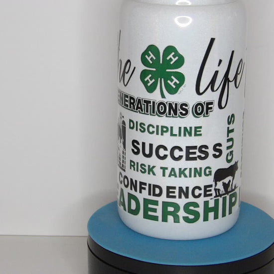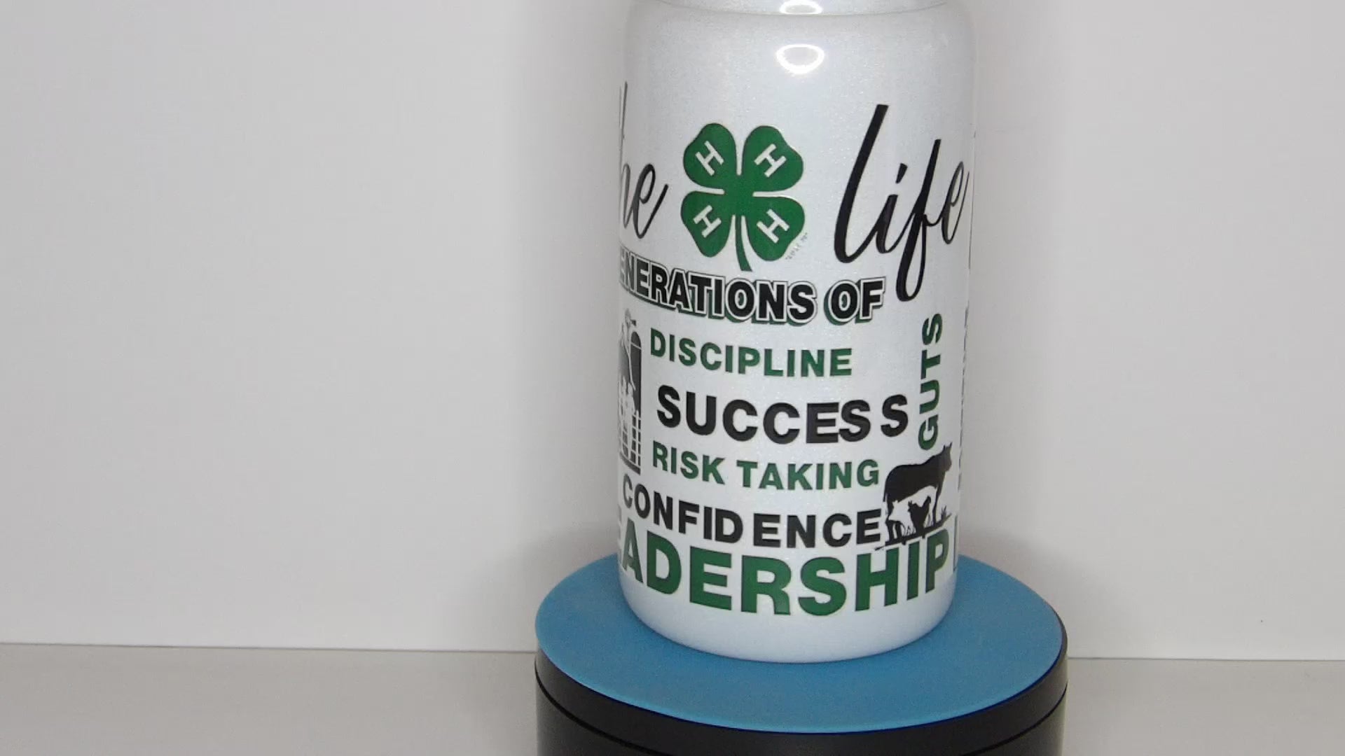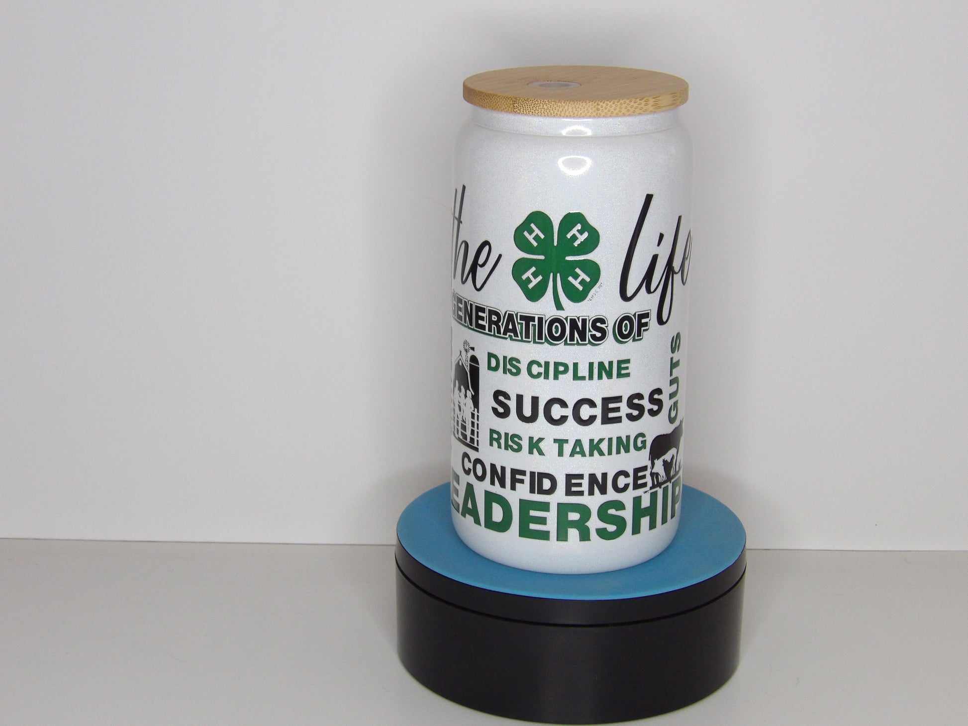Celebrate the values of leadership, success, and tradition with our 16oz 4-H Life Glass Canister. This custom UV DTF-wrapped glass features powerful keywords that represent the heart of 4-H, including discipline, confidence, risk-taking, and generations of leadership. Whether you’re a proud member, alumni, or supporter, this tumbler is perfect for showing your 4-H pride every day.