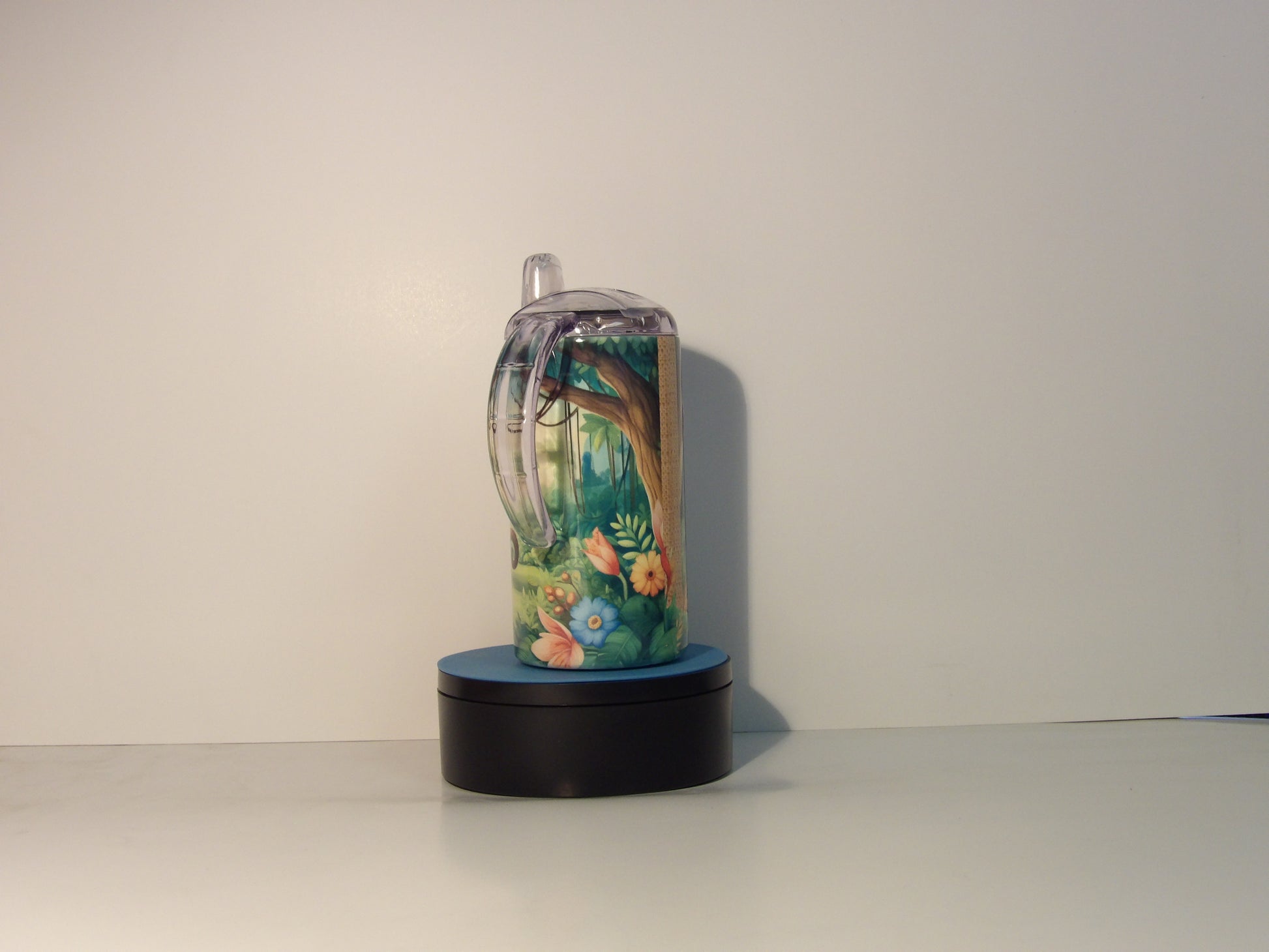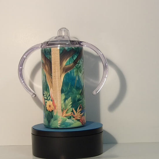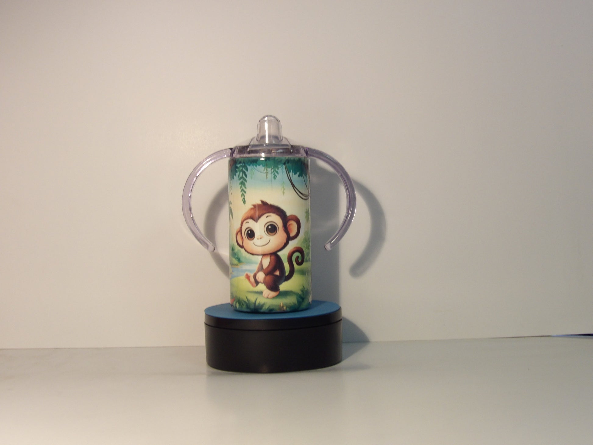 Swing into fun with this adorable 12oz stainless steel tumbler! Featuring a cheerful baby monkey surrounded by a vibrant jungle scene full of flowers, trees, and tropical adventure, this tumbler is perfect for little explorers. Designed with removable easy-grip handles and a spill-resistant sippy lid, it easily transforms into a regular tumbler as your child grows. Double-wall insulated to keep drinks hot or cold for hours, this lightweight, durable cup is both practical and irresistibly cute for active toddlers.