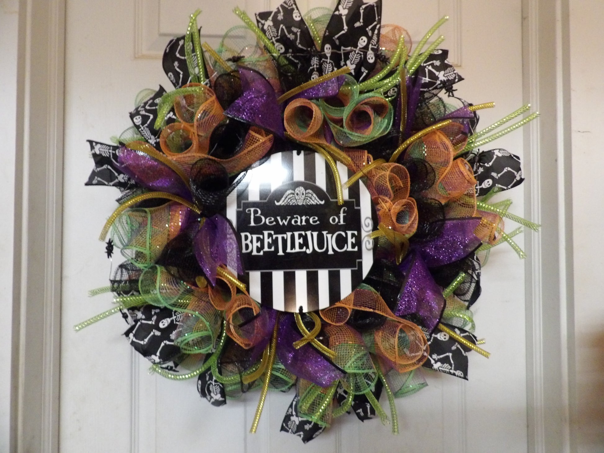 Add a spooky statement to your Halloween décor with this vibrant “Beware of Beetlejuice” mesh wreath. Handmade in the USA, this eye-catching wreath features layers of premium deco mesh in classic Halloween colors—purple, green, black, and orange—accented with glittery ribbon, skeleton print details, and a bold “Beware of Beetlejuice” center sign.