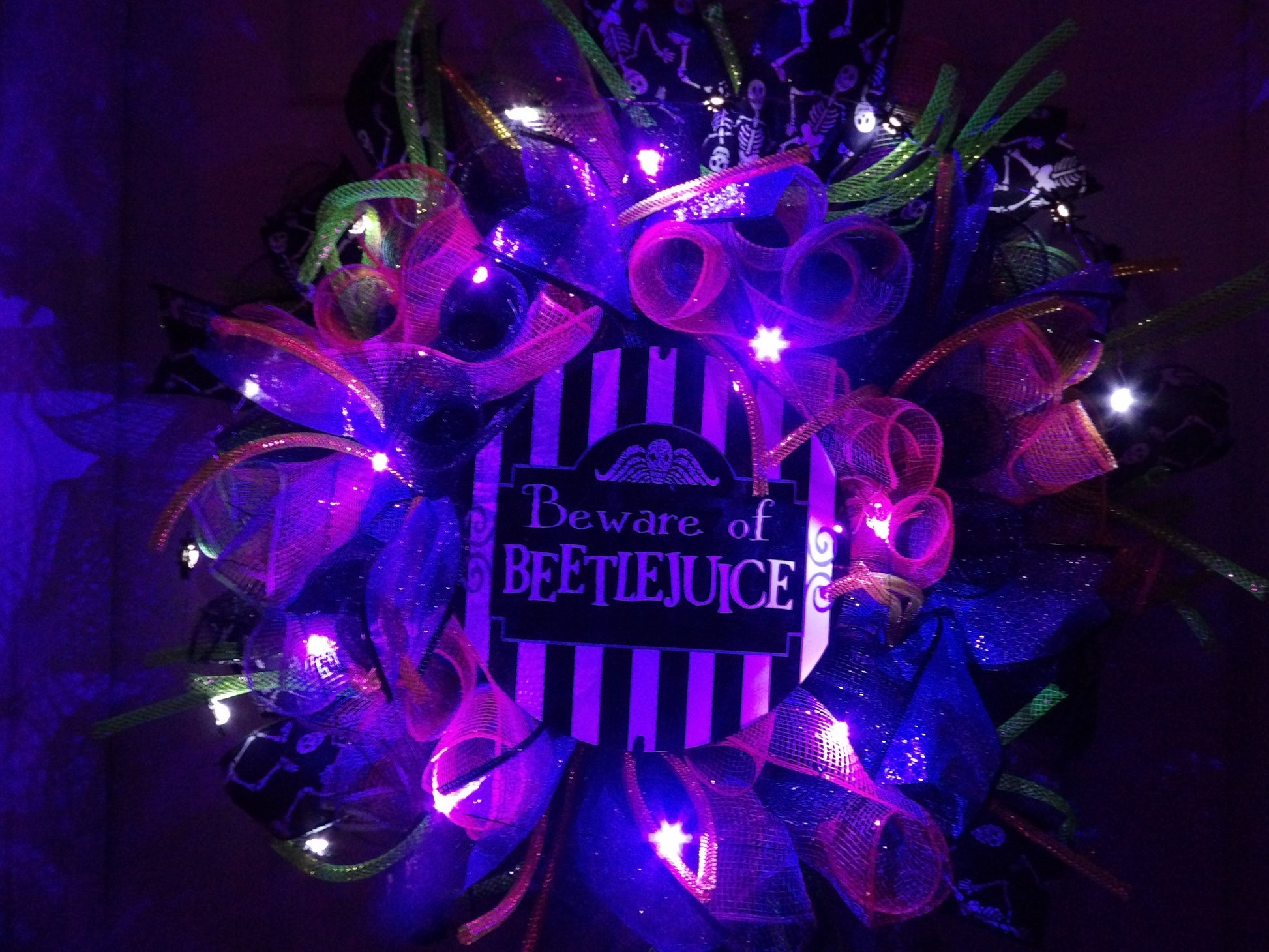 "Beware of Beetlejuice" Light-Up Halloween Wreath – Handmade Deco Mesh Door Decor