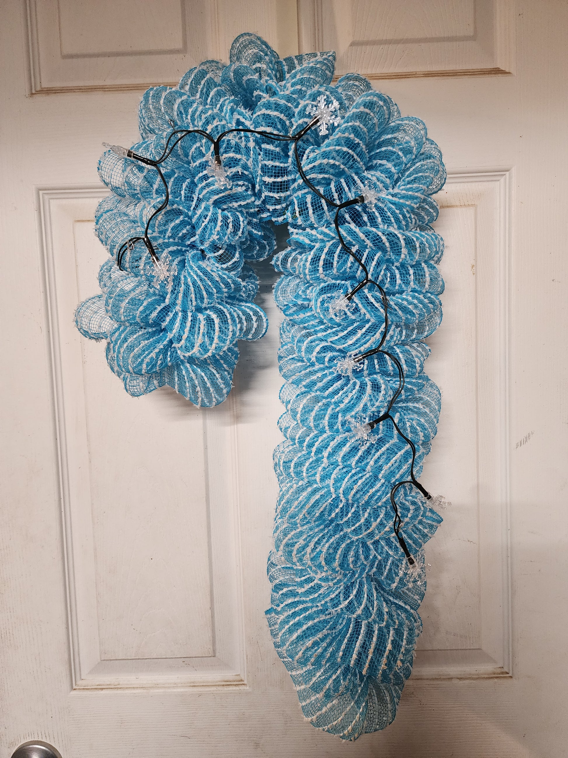 Have fun with this simple yet elegant candy cane wreath. With ripples of blue deco mesh that has snowballs in it and the blue snowflakes gives off that winter vibe.