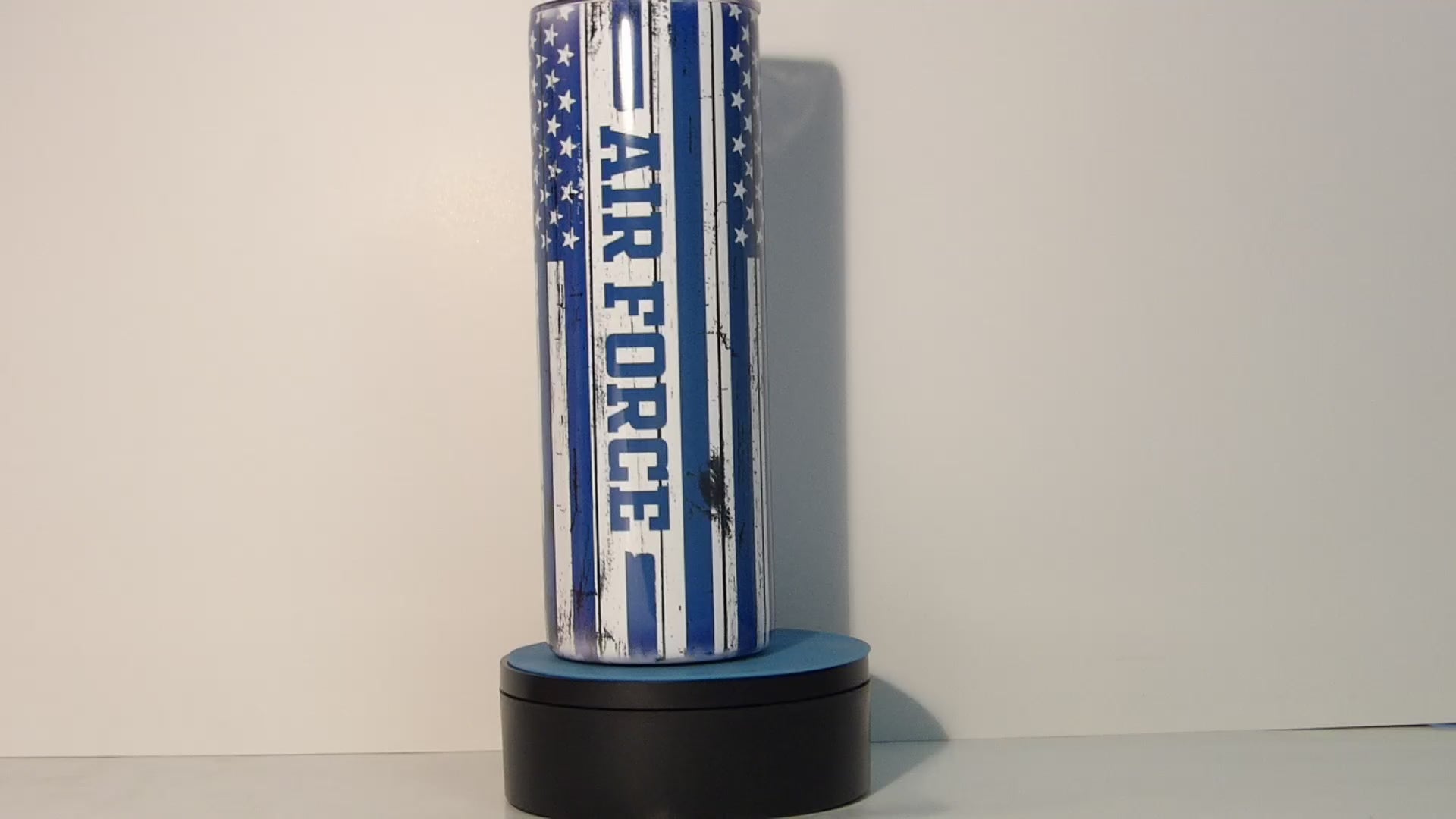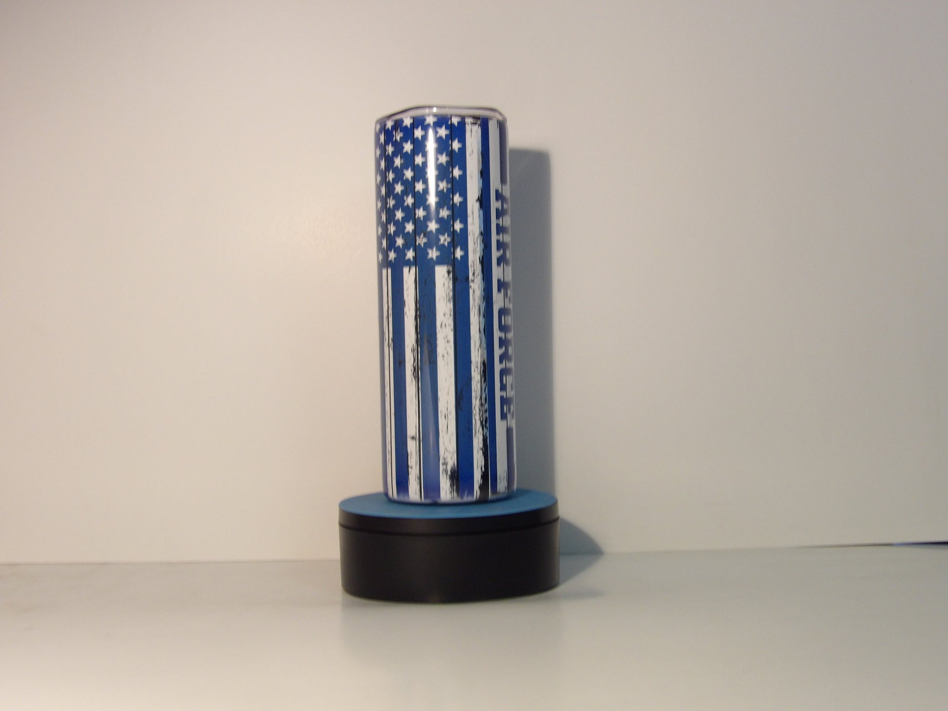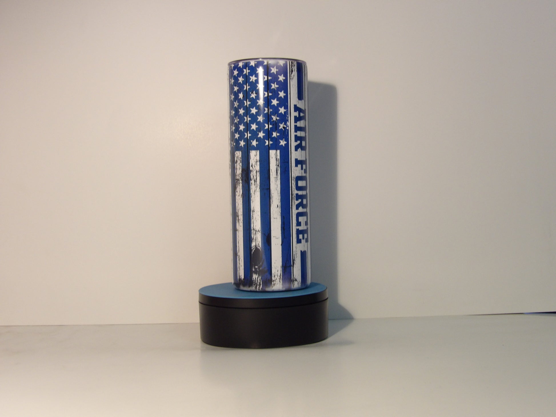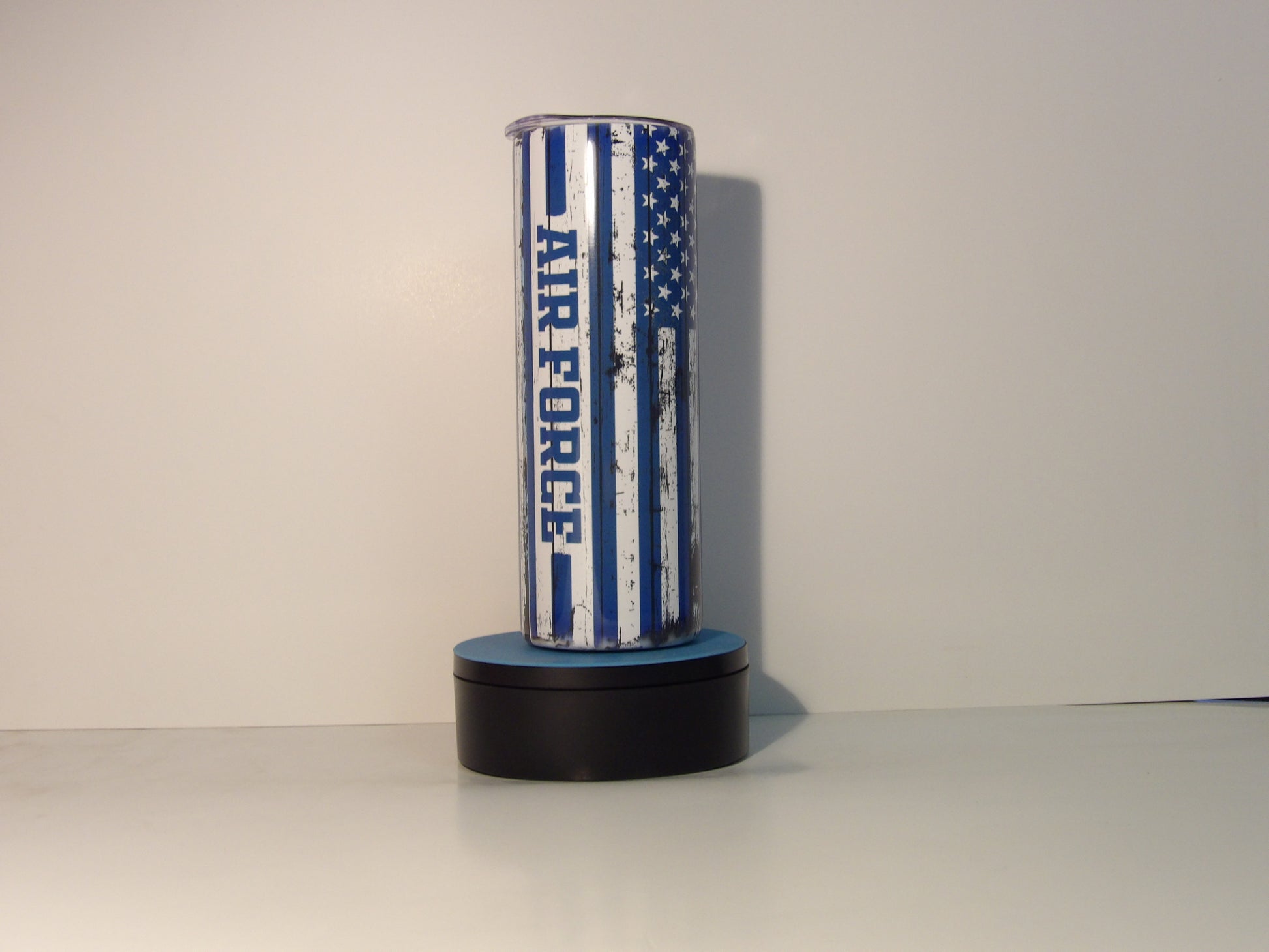 SEO Keywords: Air Force tumbler, 20oz military travel mug, patriotic Air Force cup, American flag blue stripe tumbler, insulated tumbler with straw, hot and cold Air Force drinkware, veteran gift idea, U.S. Air Force coffee cup.
