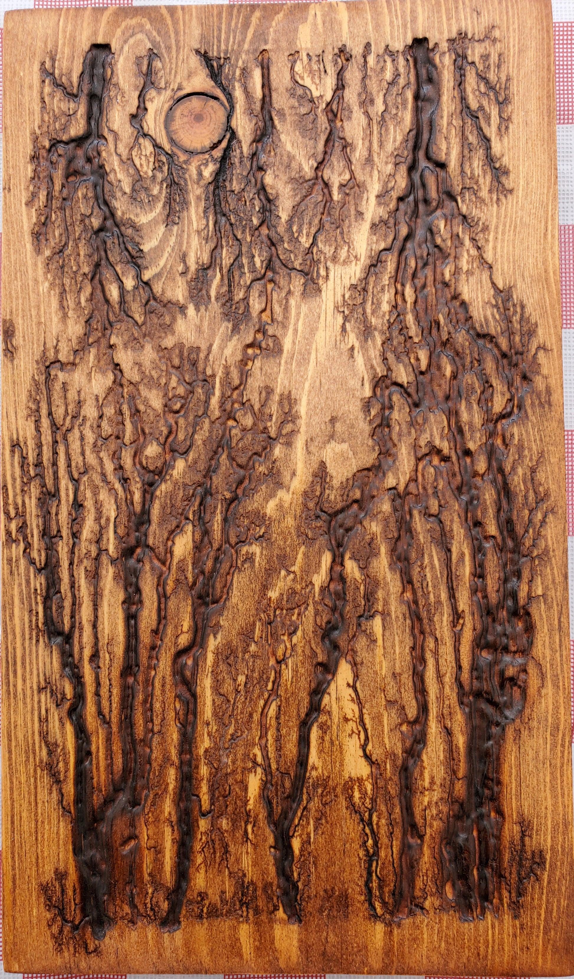 This 5.5x9.5 English Chestnut board is one of a kind. Fractal burning goes with the grain of the wood. Every piece is unique in pattern. The board can be hung vertical or horizontal.