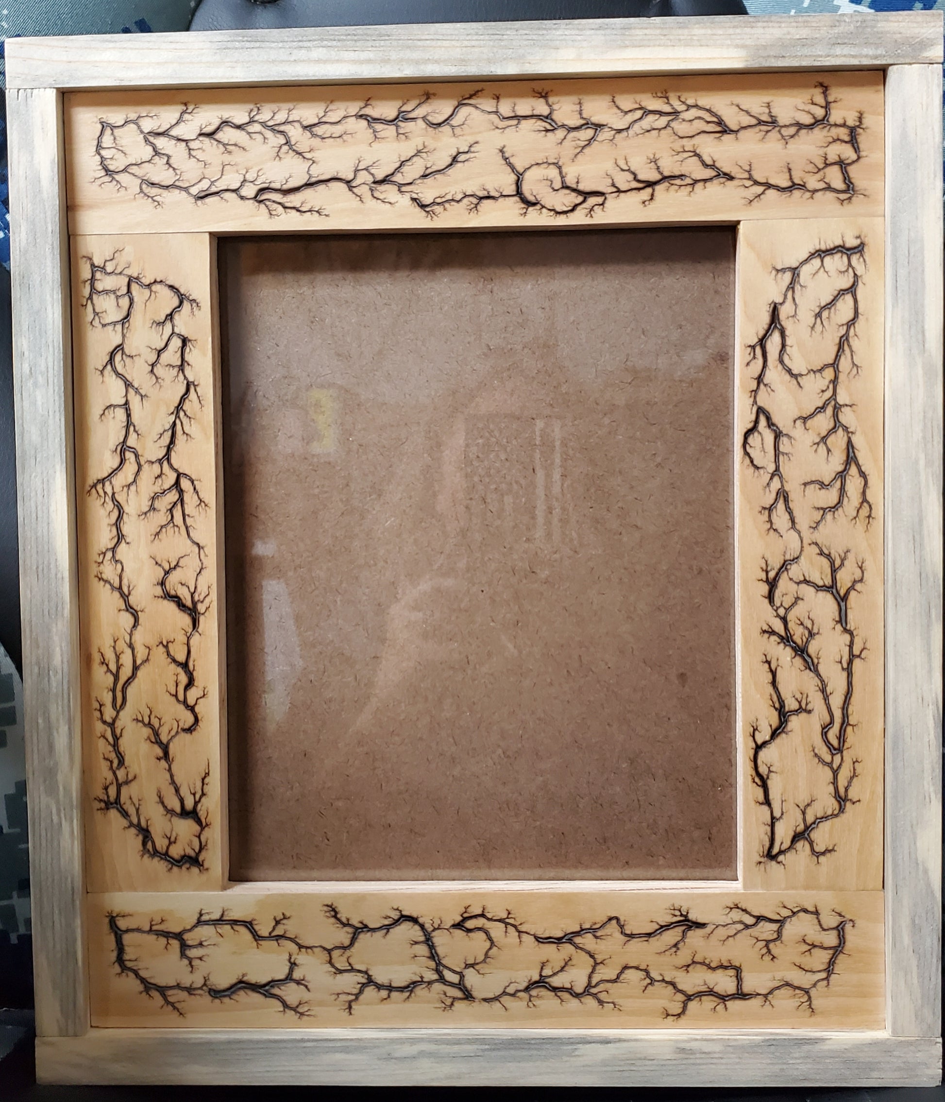 This is a one of a kind picture frame, that has a unique burn pattern on the inside area surrounding the picture, and then is surrounded by a blue pine frame. Place your special memories in an unique frame. All picture frames will be different because of the burn pattern. The pattern goes with the grain of the wood. Burn patterns may vary from original photo.