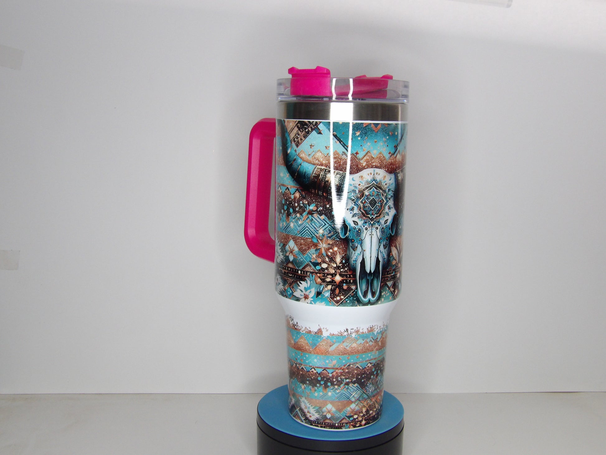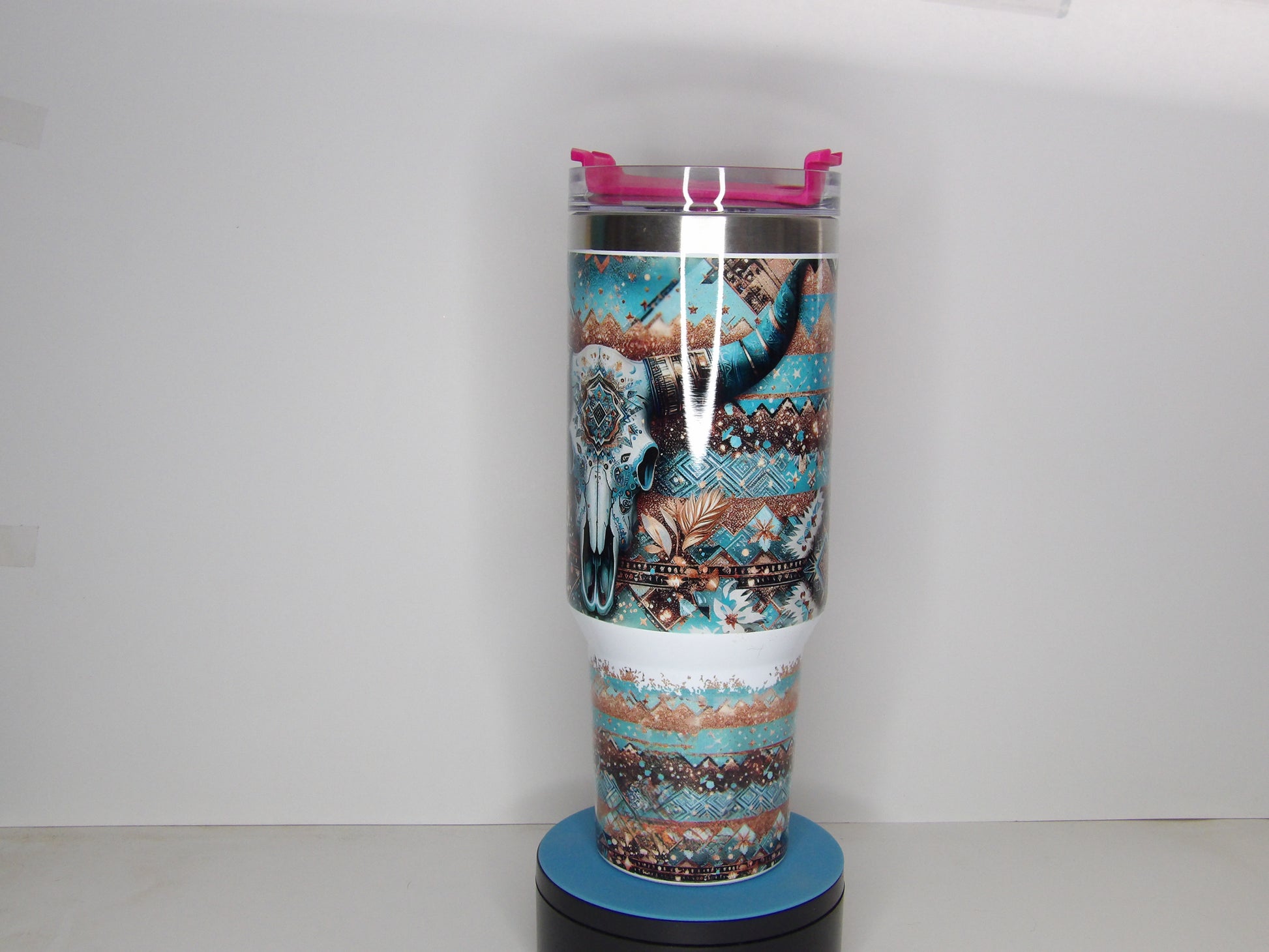 Stay hydrated in style with this bold 40oz tumbler featuring a boho cow skull and turquoise Aztec pattern. Perfect for western lovers, this eye-catching design combines rustic charm with modern functionality. The large capacity makes it ideal for all-day hydration—whether you're at work, on the go, or enjoying the outdoors.