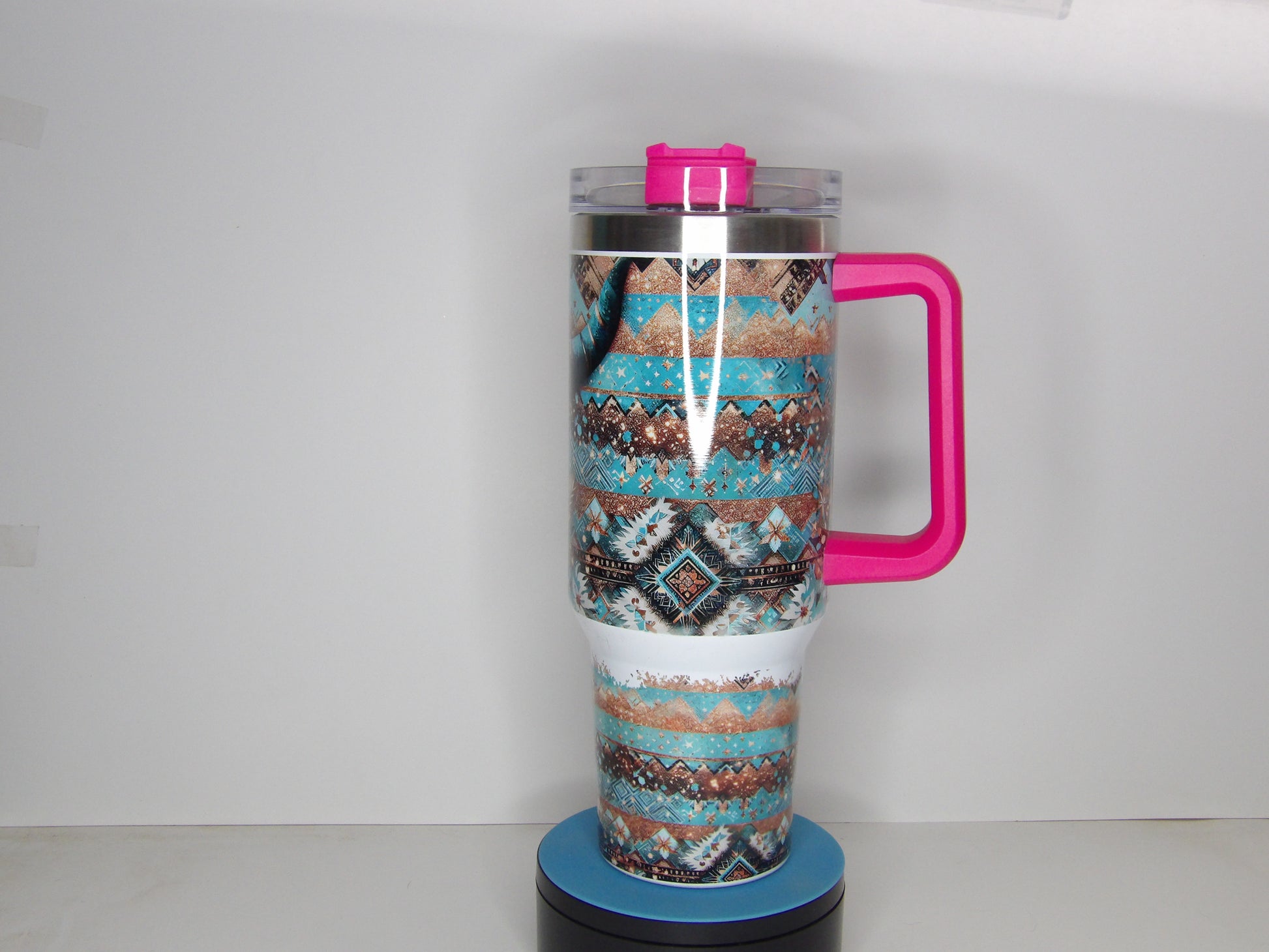 SEO Keywords: 40oz cow skull tumbler, boho western tumbler, Aztec print travel cup, large boho drink tumbler, handmade USA tumbler, reusable straw tumbler with handle, rustic western cup