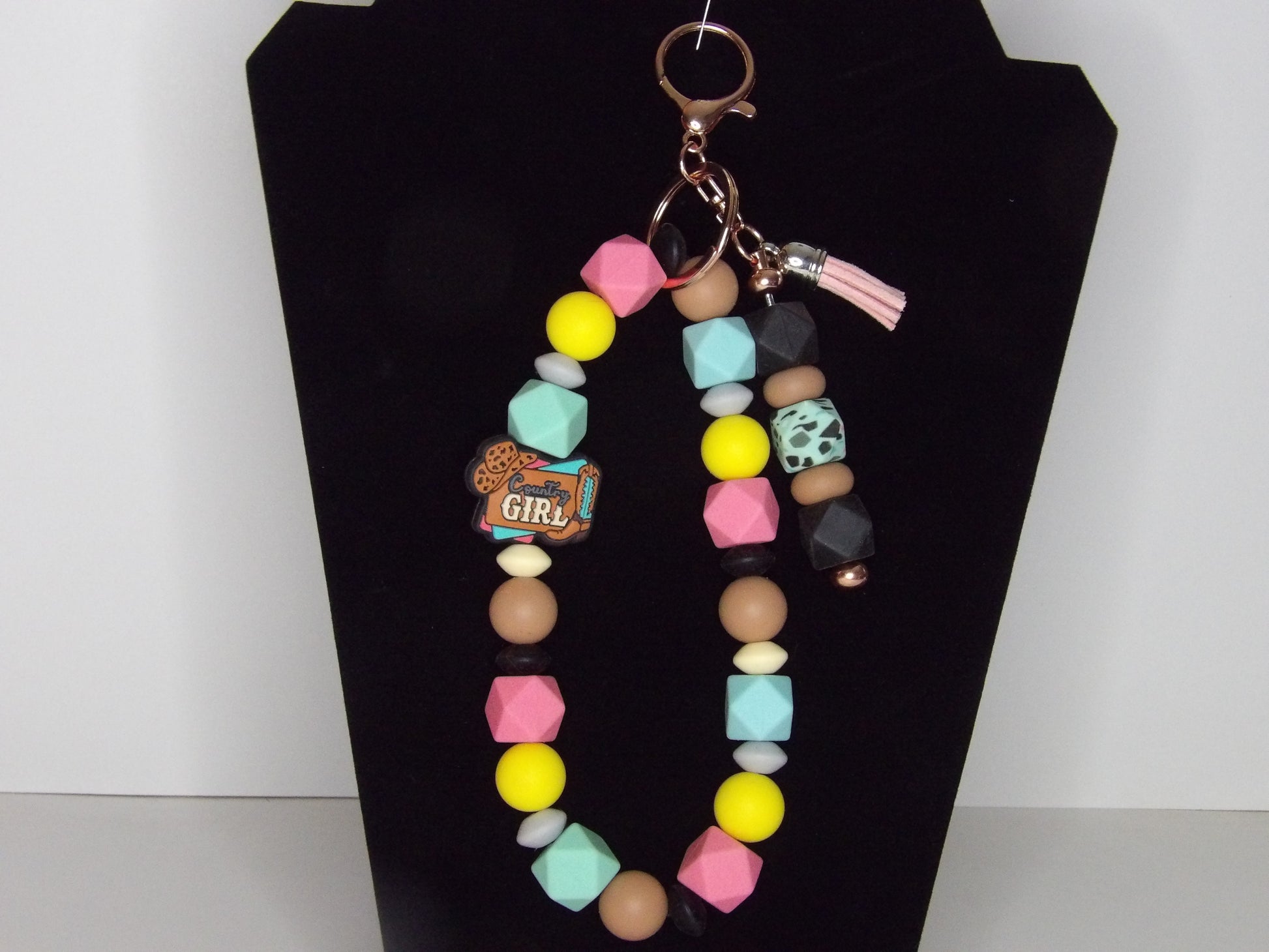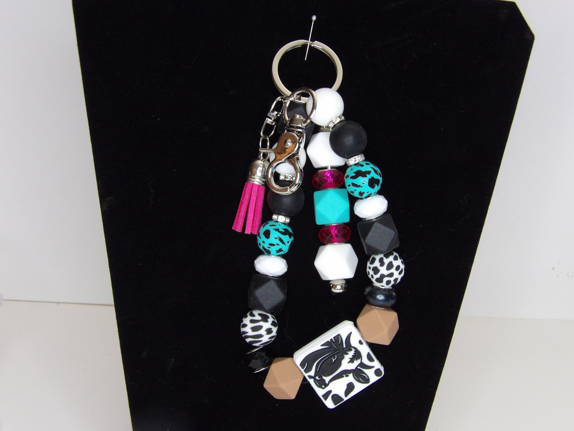 Add a bold and functional accessory to your everyday essentials with this handmade beaded wristlet keychain set. Featuring a vibrant mix of silicone and acrylic beads in trendy patterns—such as animal print, turquoise, and faceted geometric shapes—this wristlet is both stylish and practical. The design includes an attached keyring, secure lobster clasp, and an additional coordinating keychain with a faux leather tassel for extra flair.