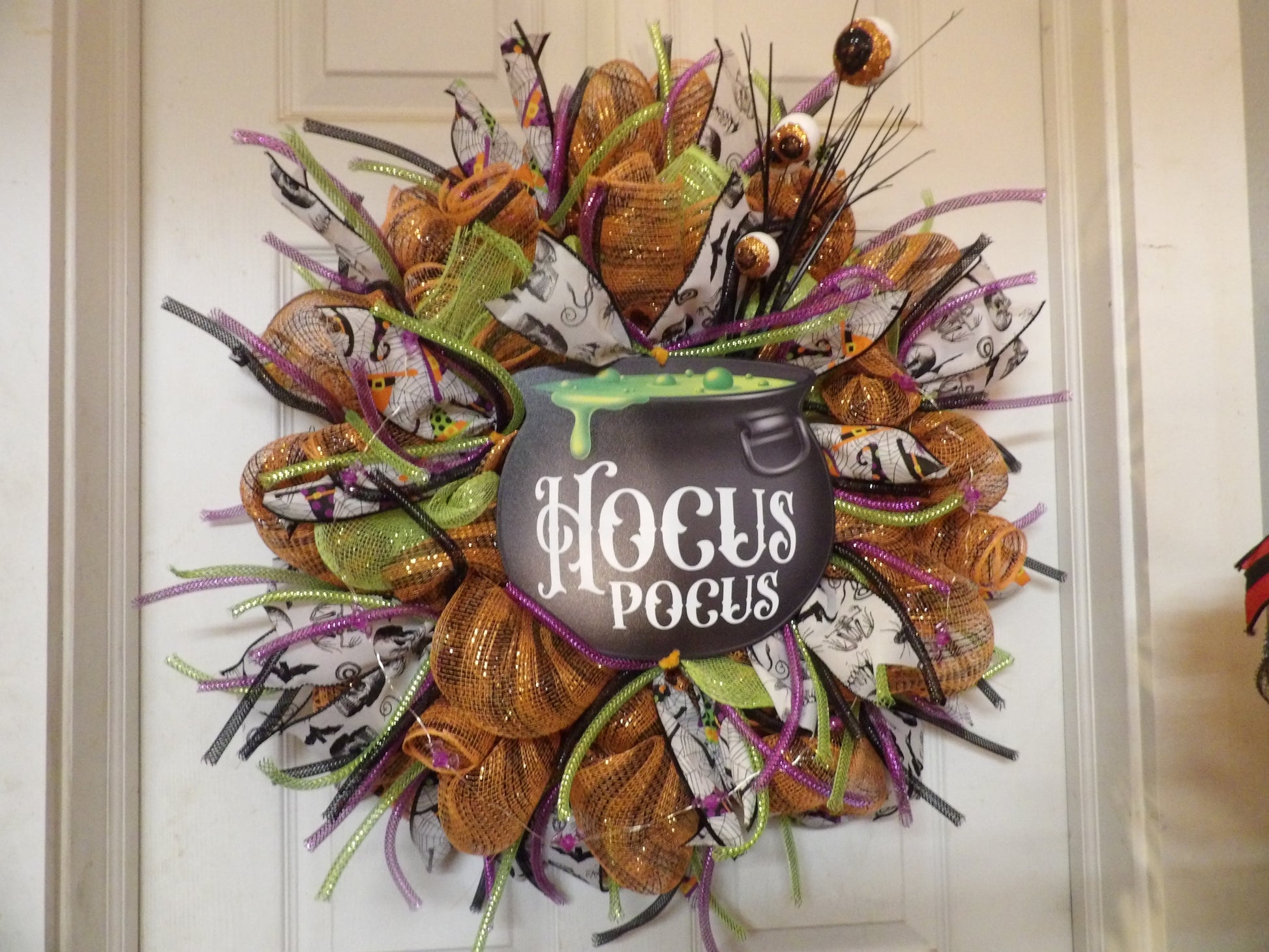 Handmade Halloween wreath featuring a Hocus Pocus cauldron design