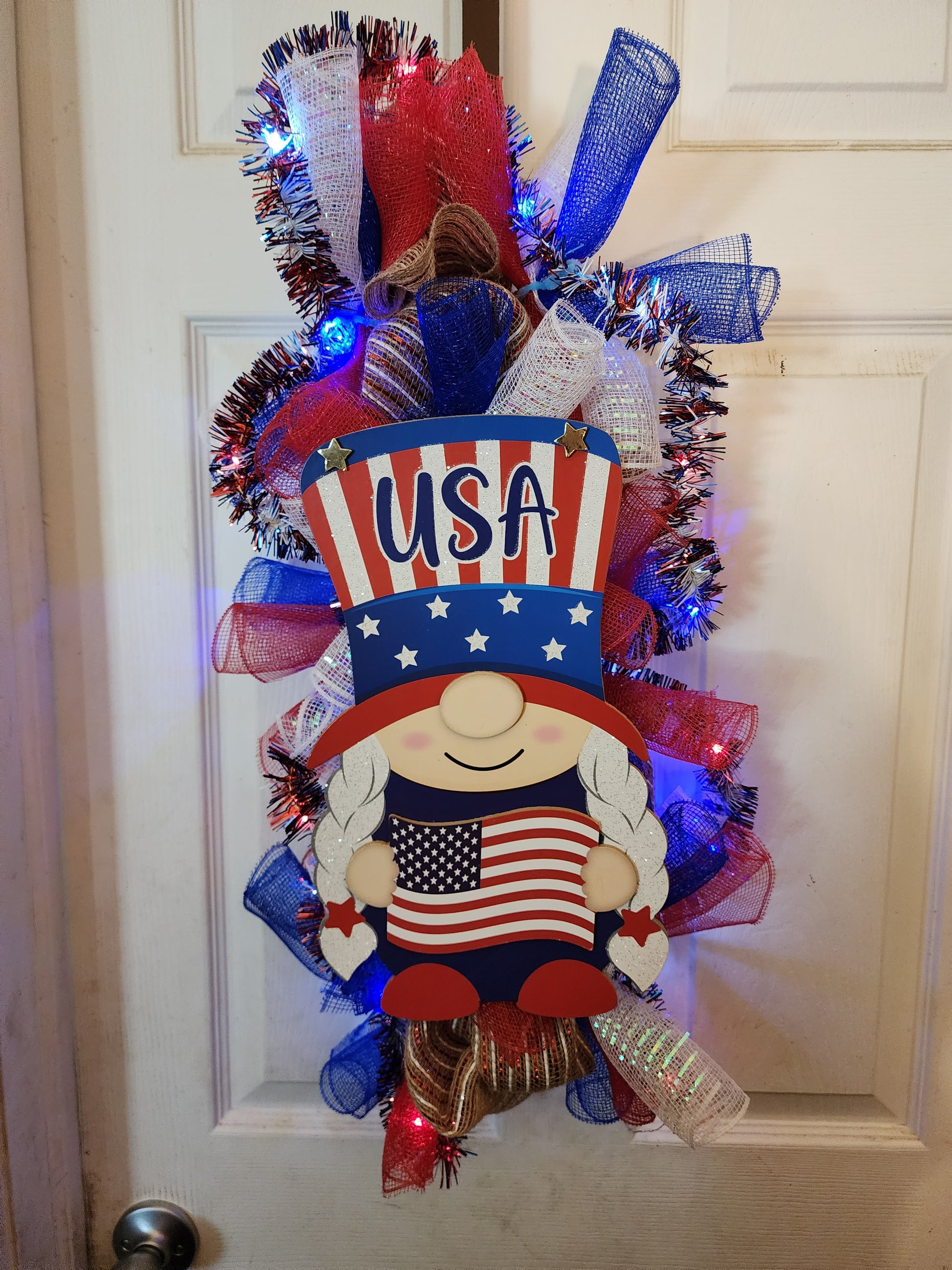 This swag is about two feet long has a male gnome holding a sign that says U.S.A. This gnome is set on a background of burlap. Then has a bundle of red/white/blue foil deco mesh curls. Surrounding all of it are lights that are operated by three AA batteries that can easily be changed out.