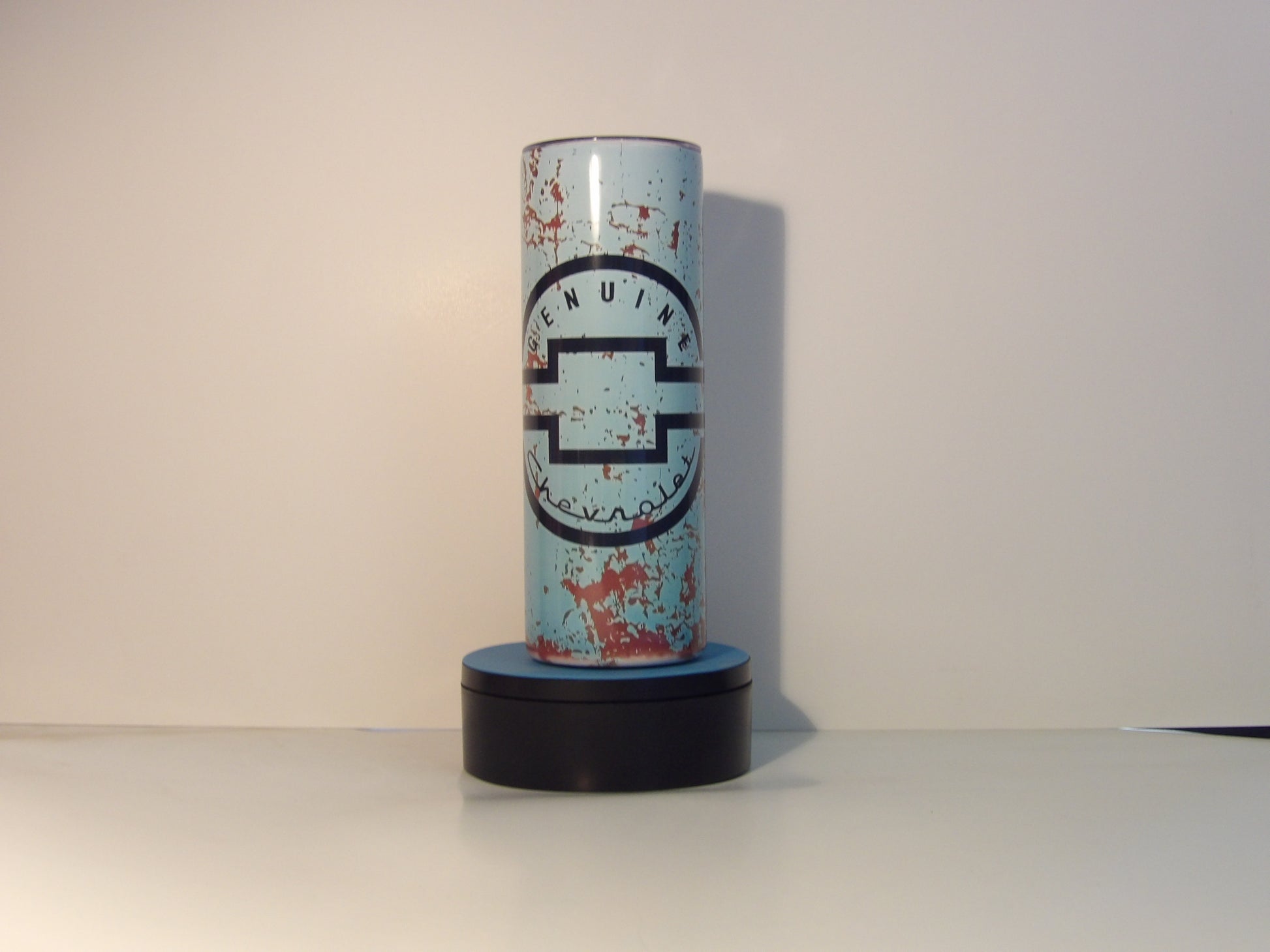 Show your Chevy pride with this rugged 20oz stainless steel tumbler featuring a distressed rust-and-blue finish and the iconic Chevrolet bowtie emblem. Designed for both hot and cold drinks, it includes a lid and reusable straw—perfect for the road, garage, or gift for truck lovers. Handwash only. Do not microwave.