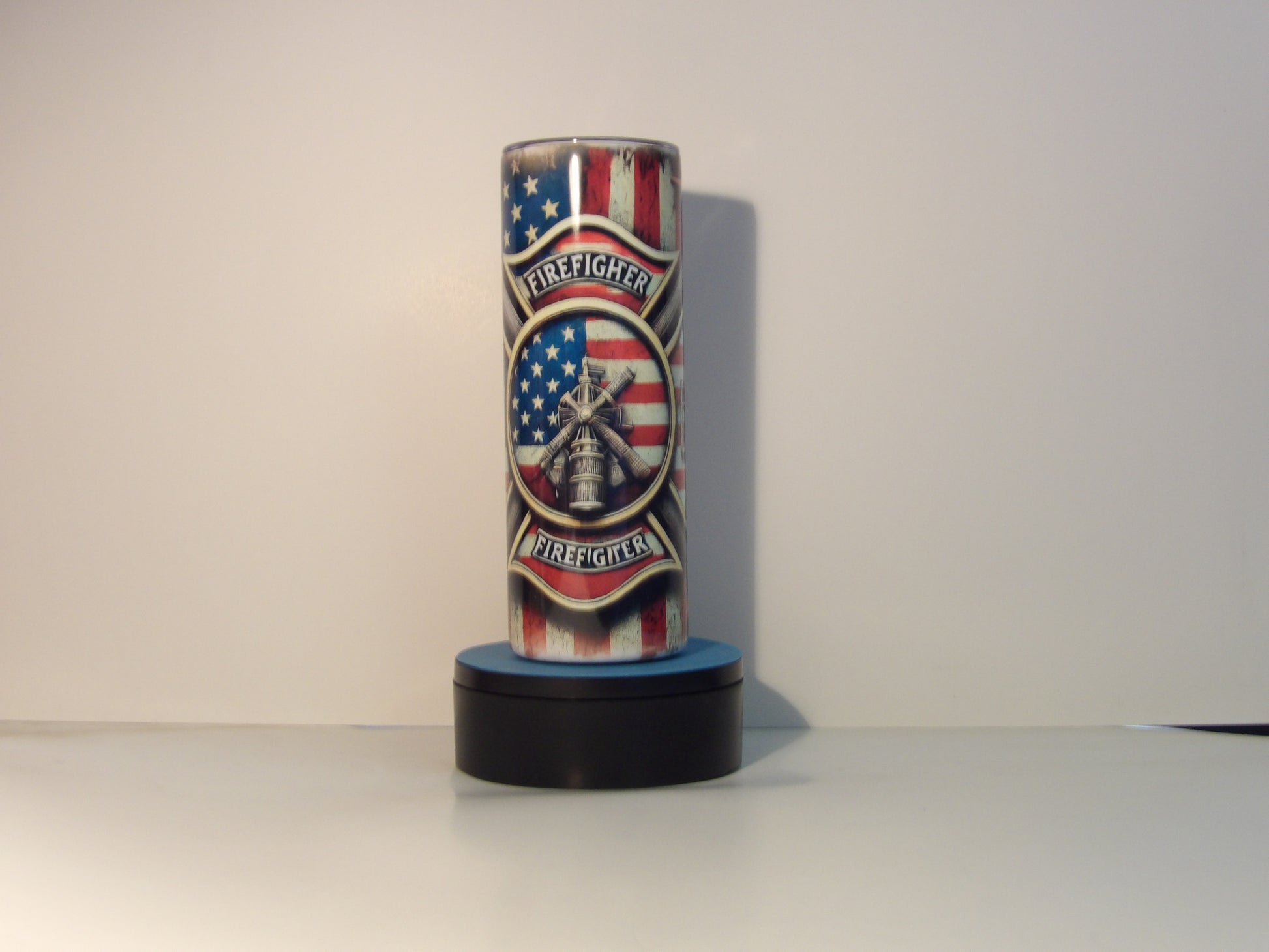 SEO Keywords: firefighter tumbler, 20oz fireman cup, American flag firefighter mug, Maltese Cross drinkware, firefighter gift idea, insulated tumbler with straw, fire department travel mug, patriotic firefighter cup.