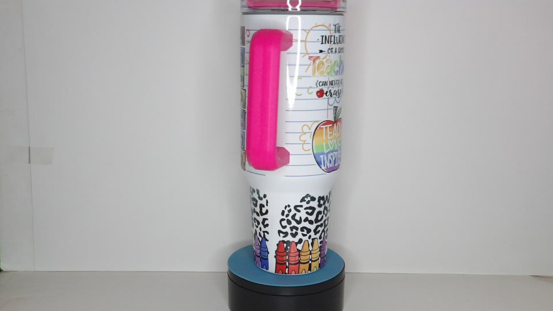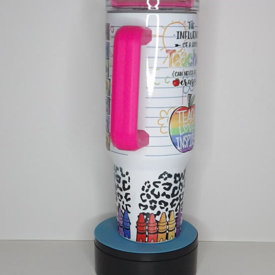 Celebrate the heart of the classroom with this vibrant 40oz Teacher-Inspired Tumbler, perfect for educators who make a lasting impact. Featuring a colorful design with school-themed graphics like crayons, apples, notebooks, and empowering words such as “Teach,” “Love,” “Inspire,” and “The Influence of a Good Teacher Can Never Be Erased,” this tumbler is a daily reminder of the power of teaching.