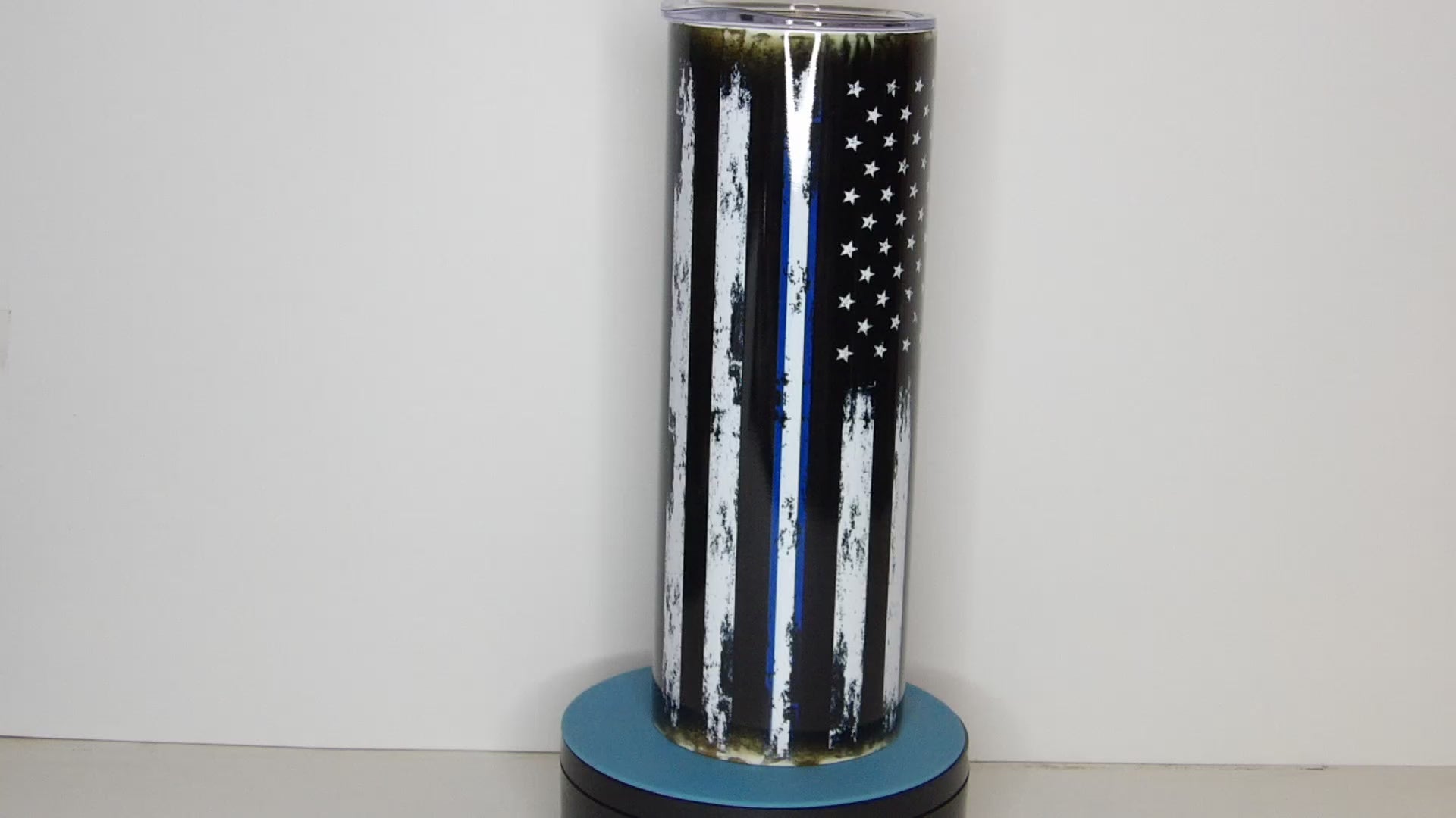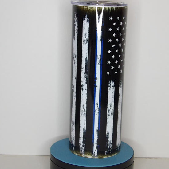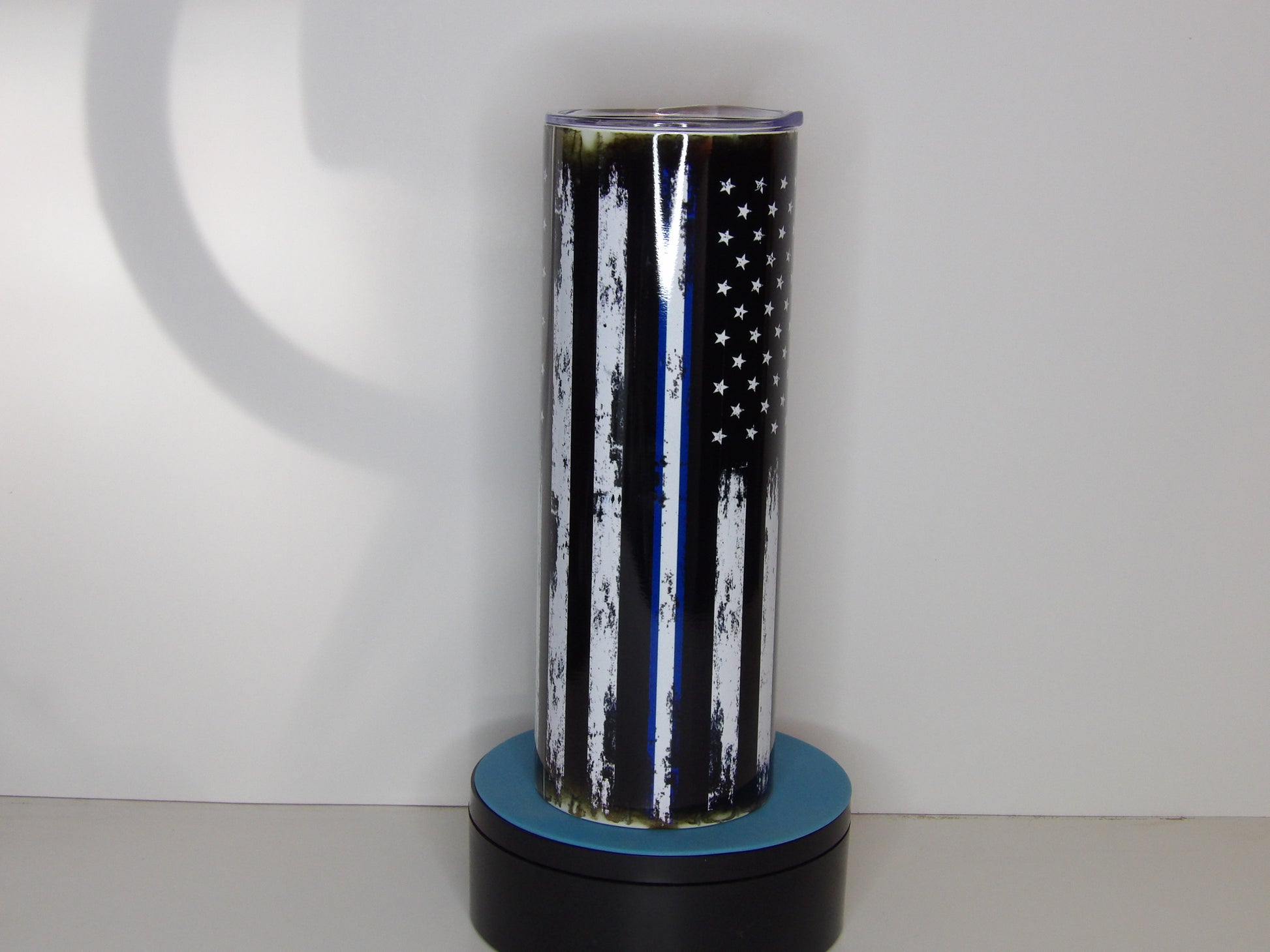 Show your support with this bold and patriotic 20oz Thin Blue & White Line tumbler! Featuring a weathered American flag design with a striking blue and white line, this stainless steel tumbler is perfect for honoring law enforcement and first responders. The vibrant UV DTF wrapped artwork makes it a standout piece for everyday use or as a heartfelt gift.