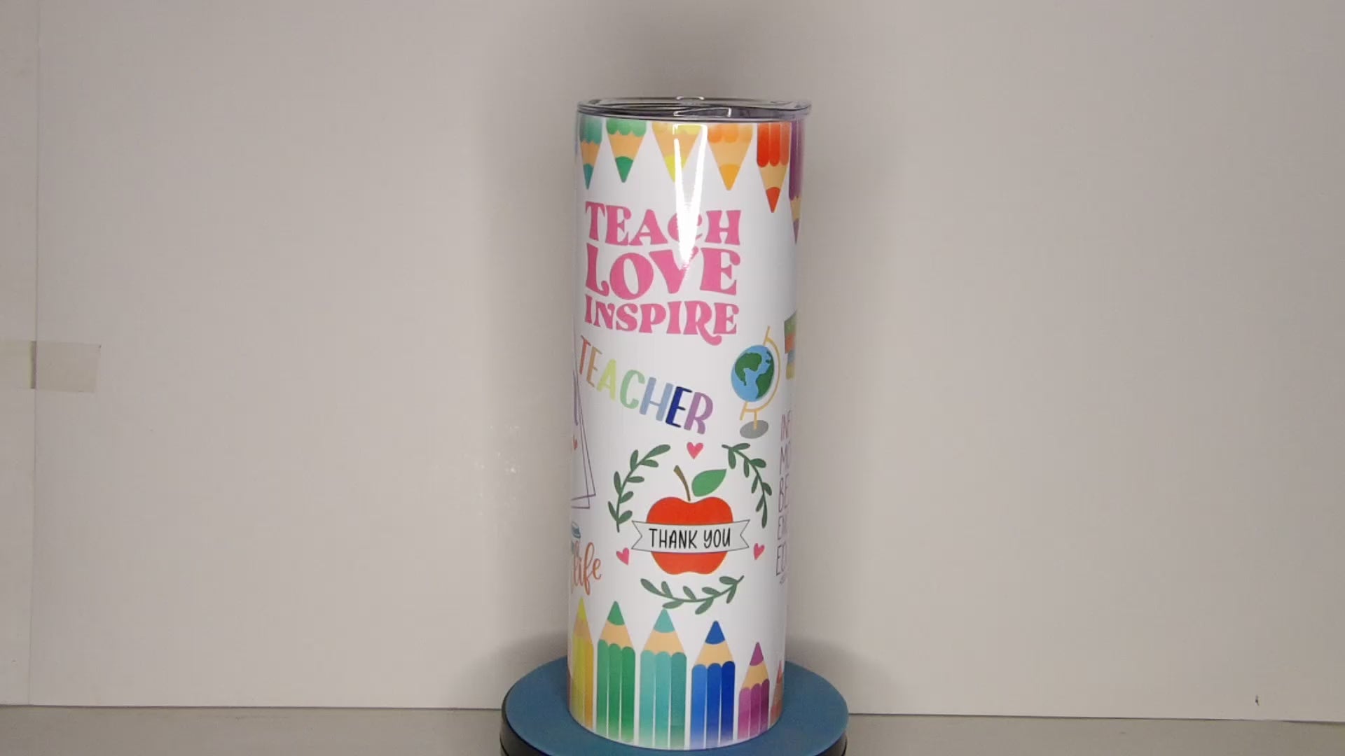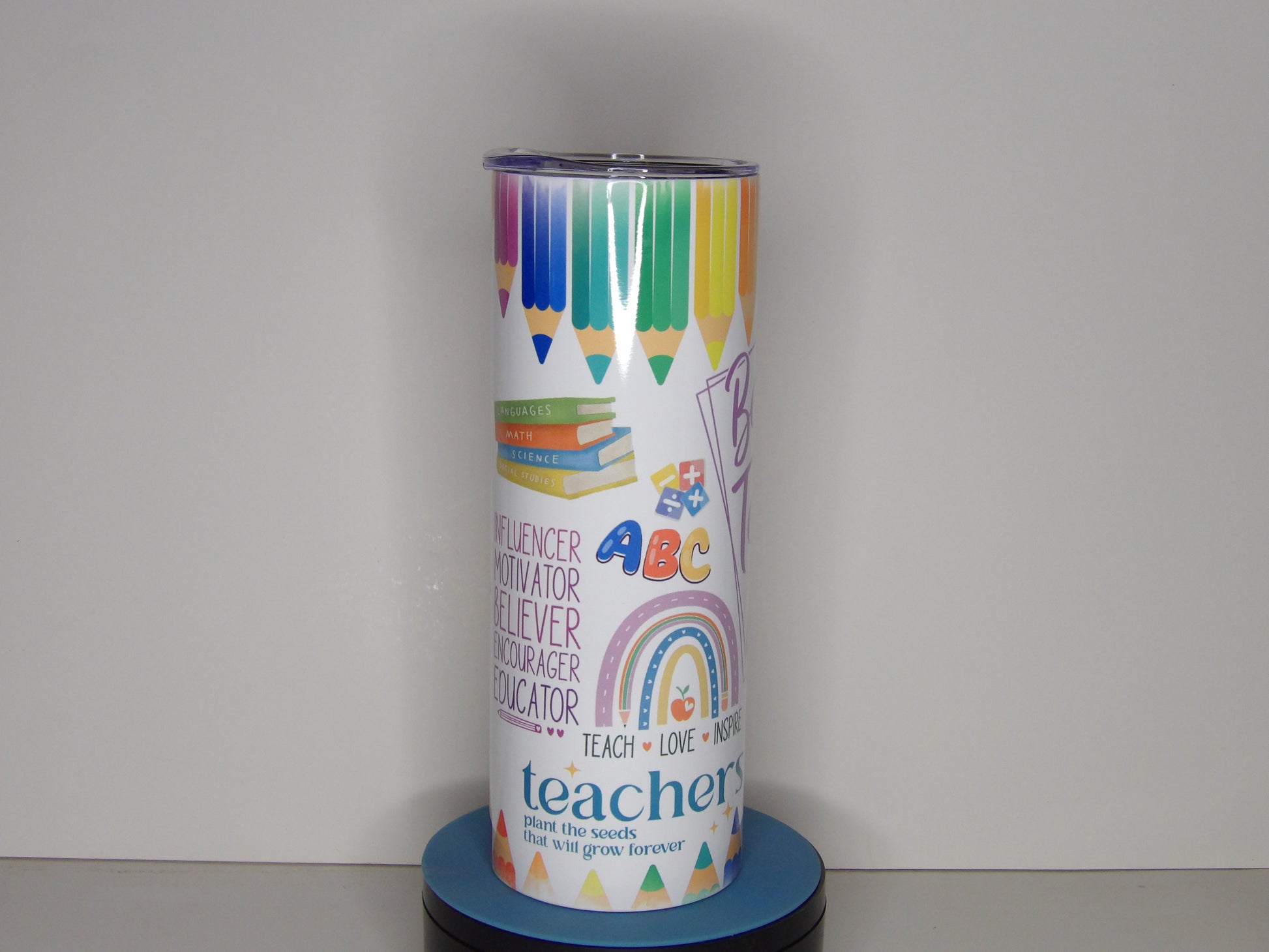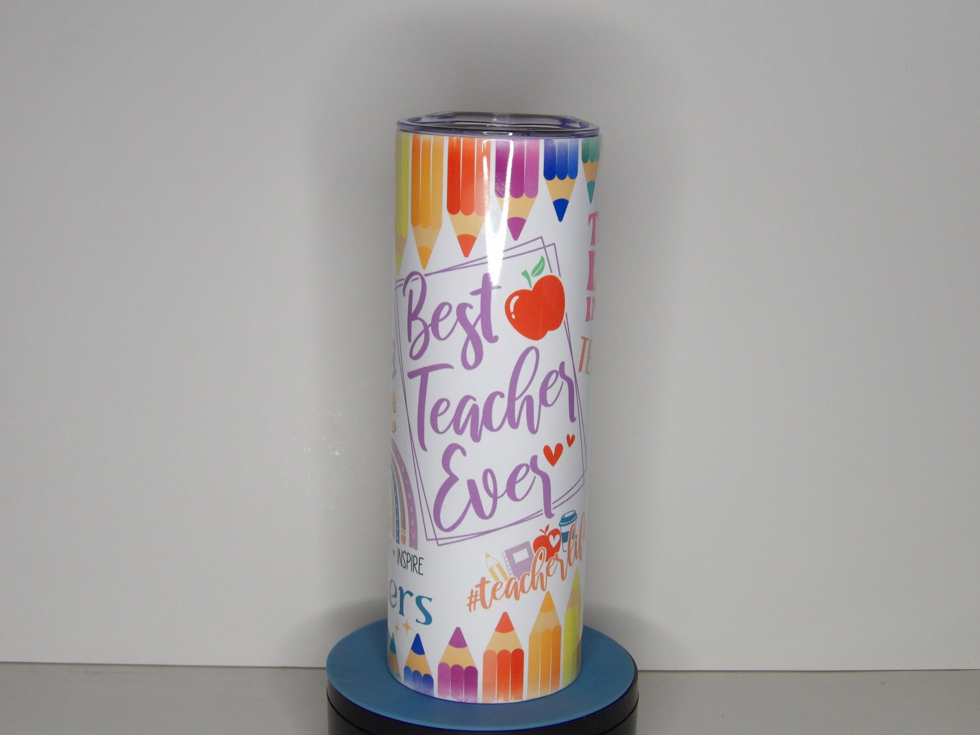 Celebrate your favorite educator with this vibrant “Best Teacher Ever” 20 oz tumbler, beautifully wrapped in a colorful design featuring pencils, rainbows, apples, and motivational words like “Teach, Love, Inspire.” This bright and cheerful tumbler makes the perfect teacher appreciation gift, classroom companion, or end-of-year thank you.