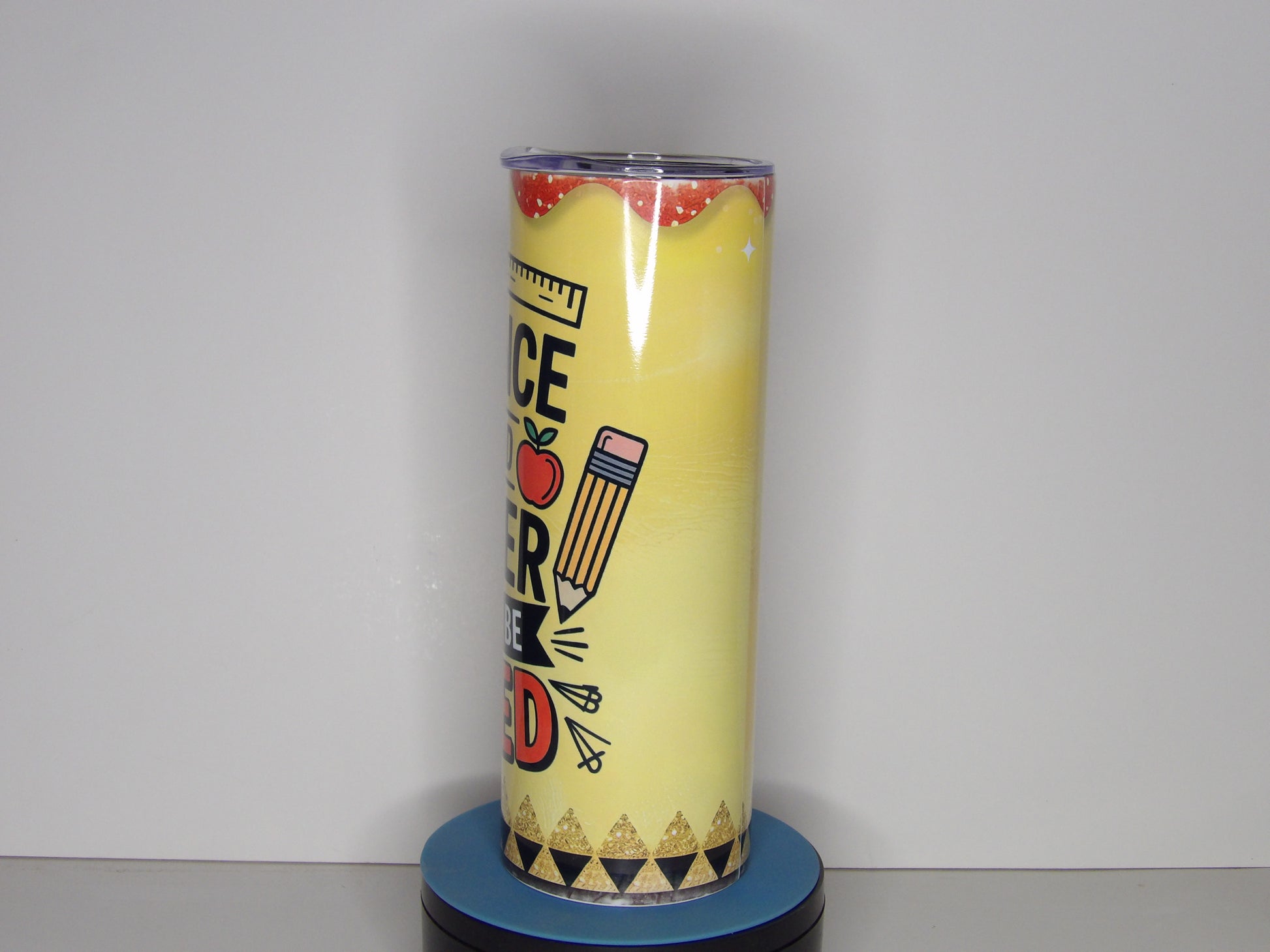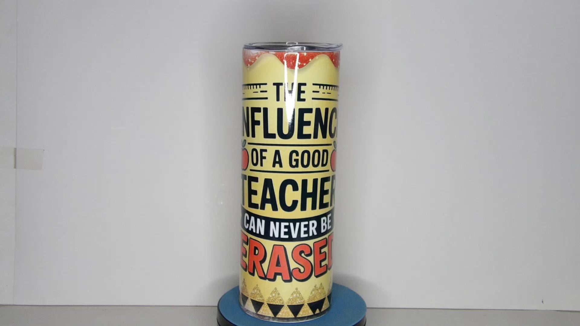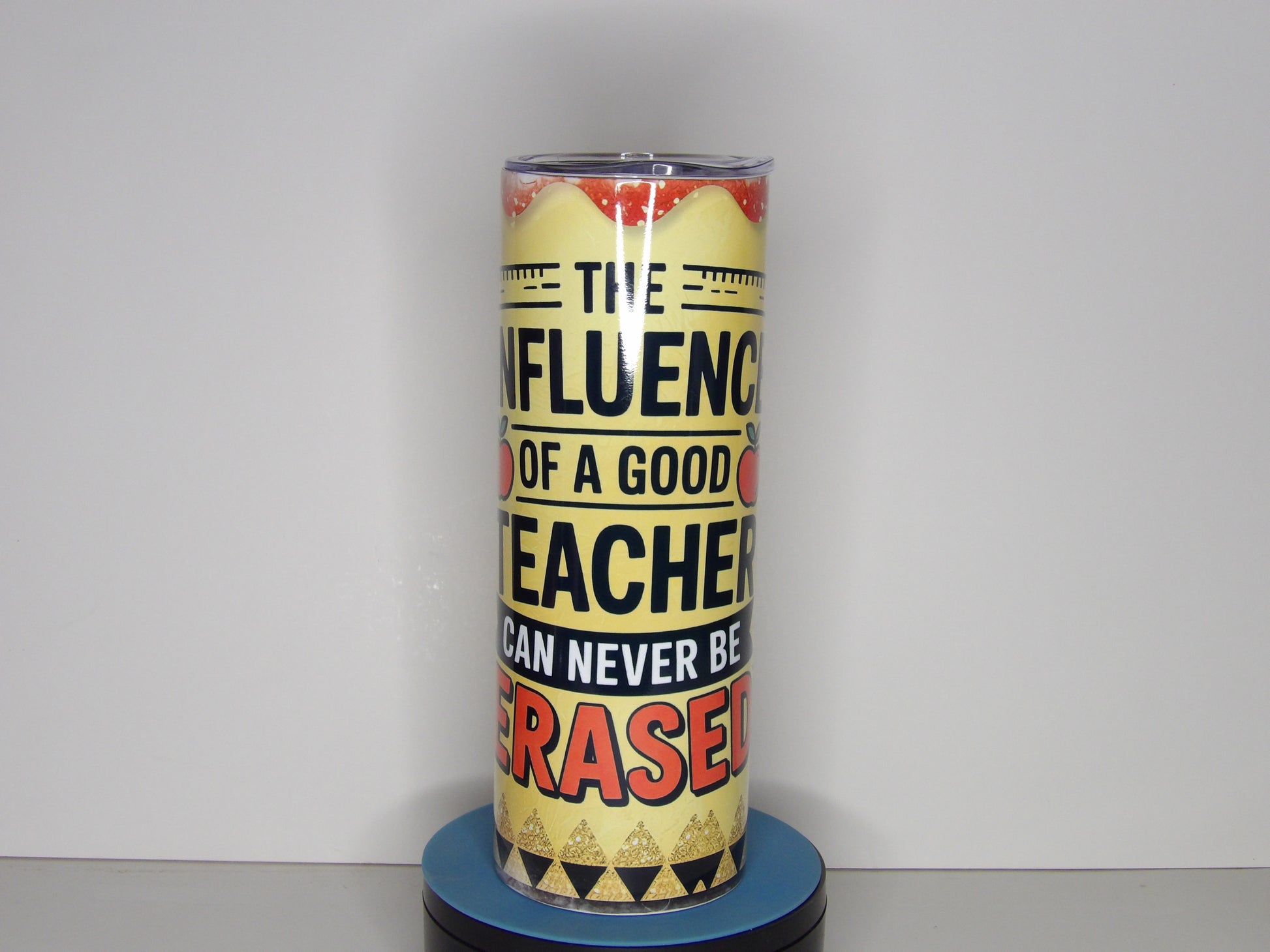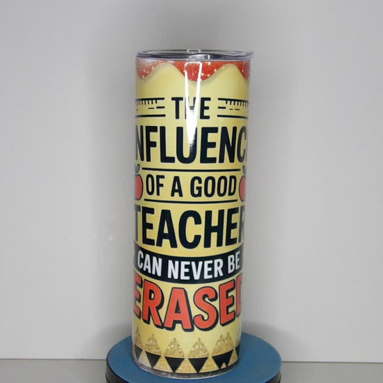 Celebrate the impact of great educators with this vibrant 20 oz sublimation tumbler, featuring the inspiring quote: “The influence of a good teacher can never be erased.” Designed with classic school-themed elements like rulers, apples, pencils, and bold colors, this tumbler makes the perfect gift for teachers who leave a lasting mark.