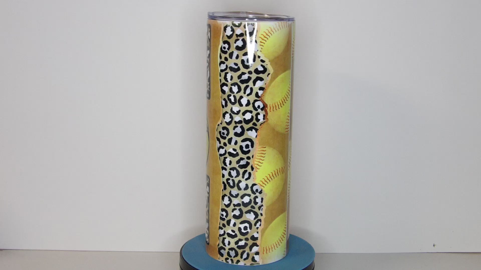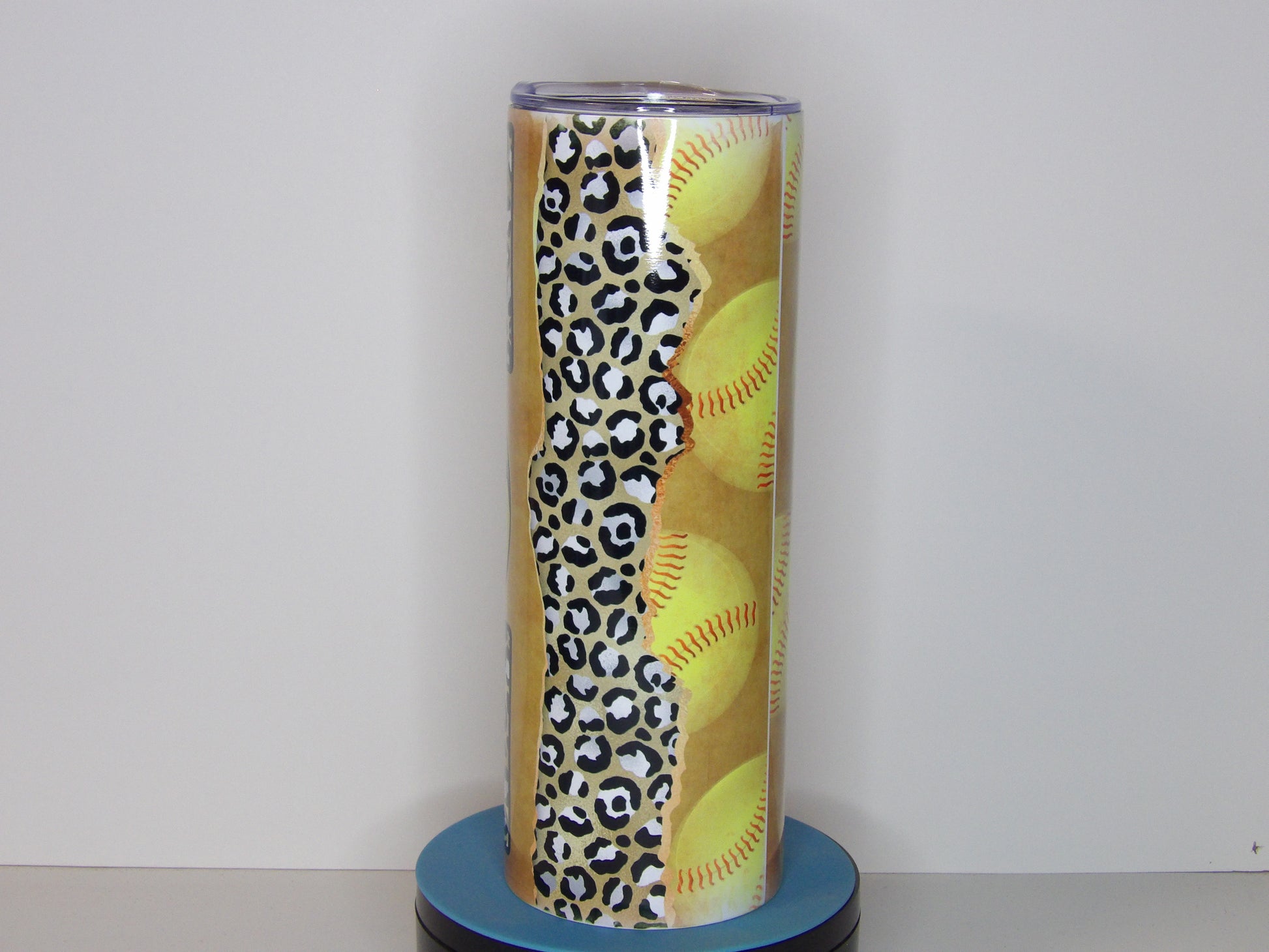 Features a high-resolution UV DTF wrap with a leopard print and softball design