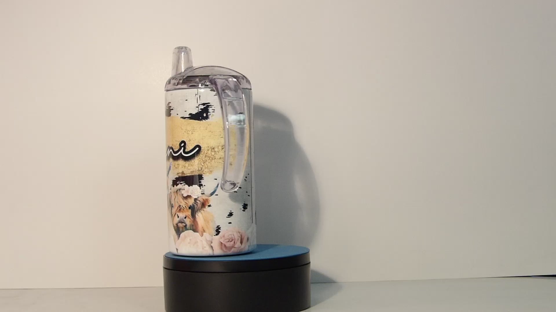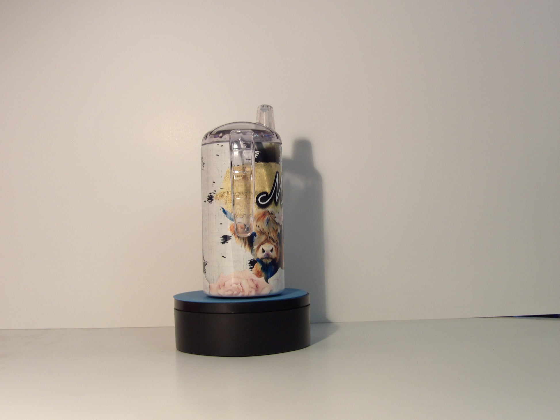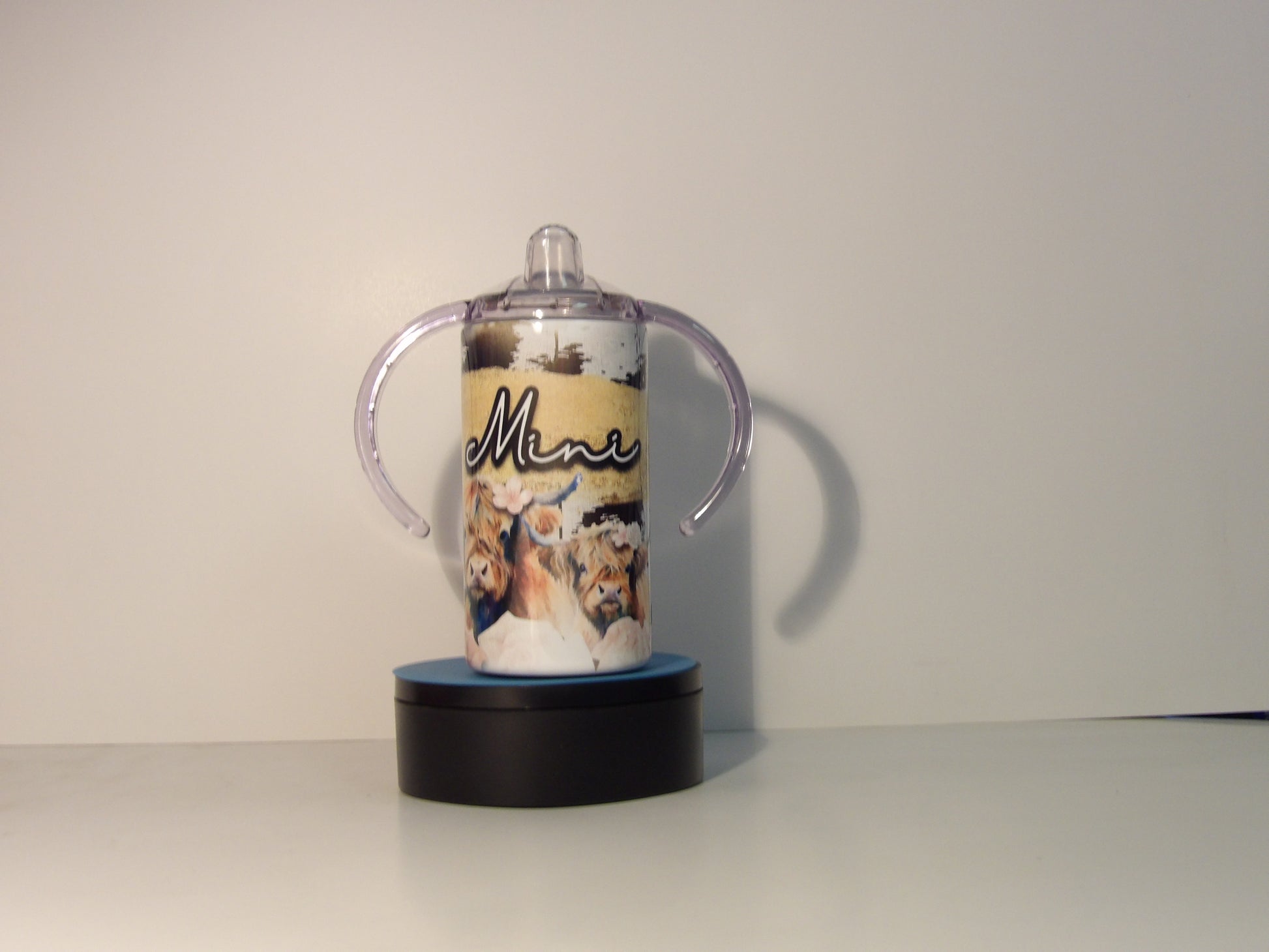 SEO Keywords: Highland cow sippy cup, 12oz toddler tumbler, kids insulated cup, hot cold sippy cup with handles, spill-proof straw cup, mini cow design tumbler, baby gift cup.