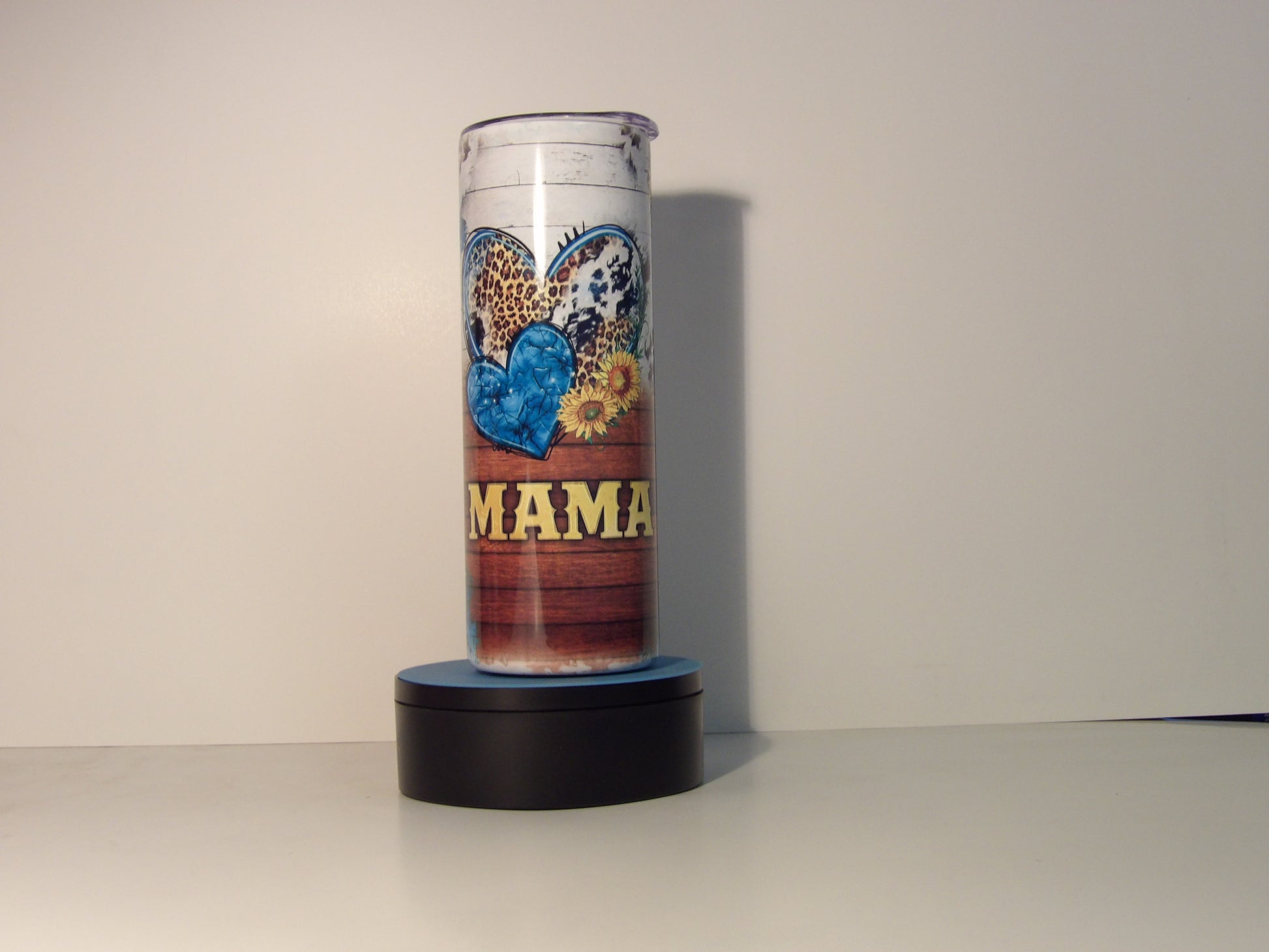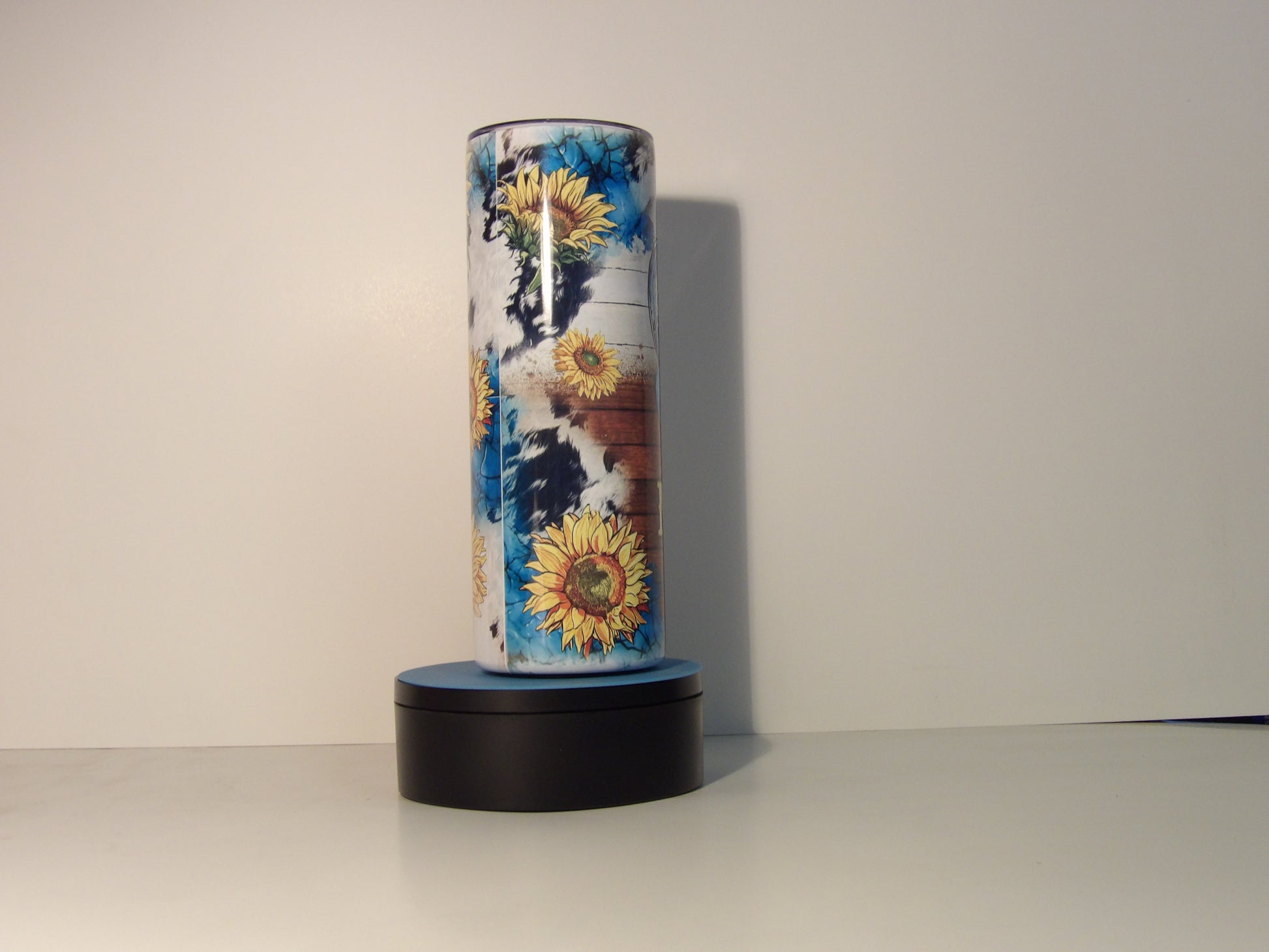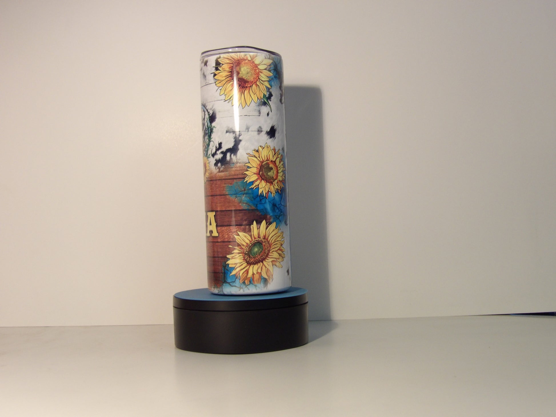 SEO keywords: 20oz tumbler for mom, sunflower tumbler, western mama tumbler, hot and cold drink tumbler, straw included, rustic cow print cup, cowgirl mom gift.