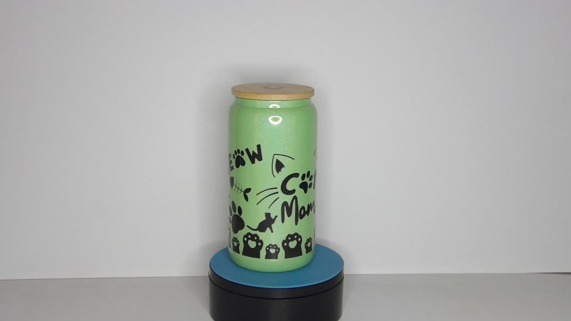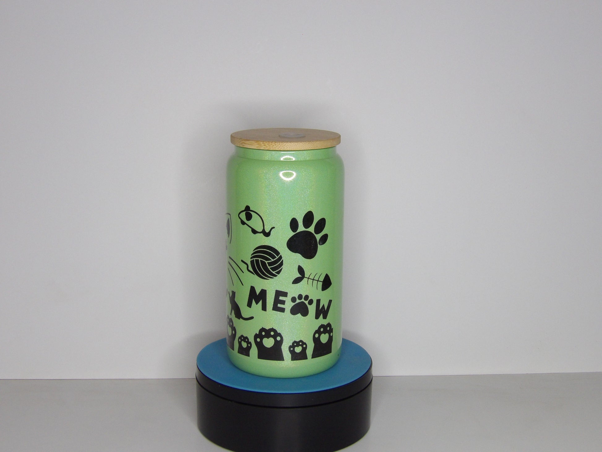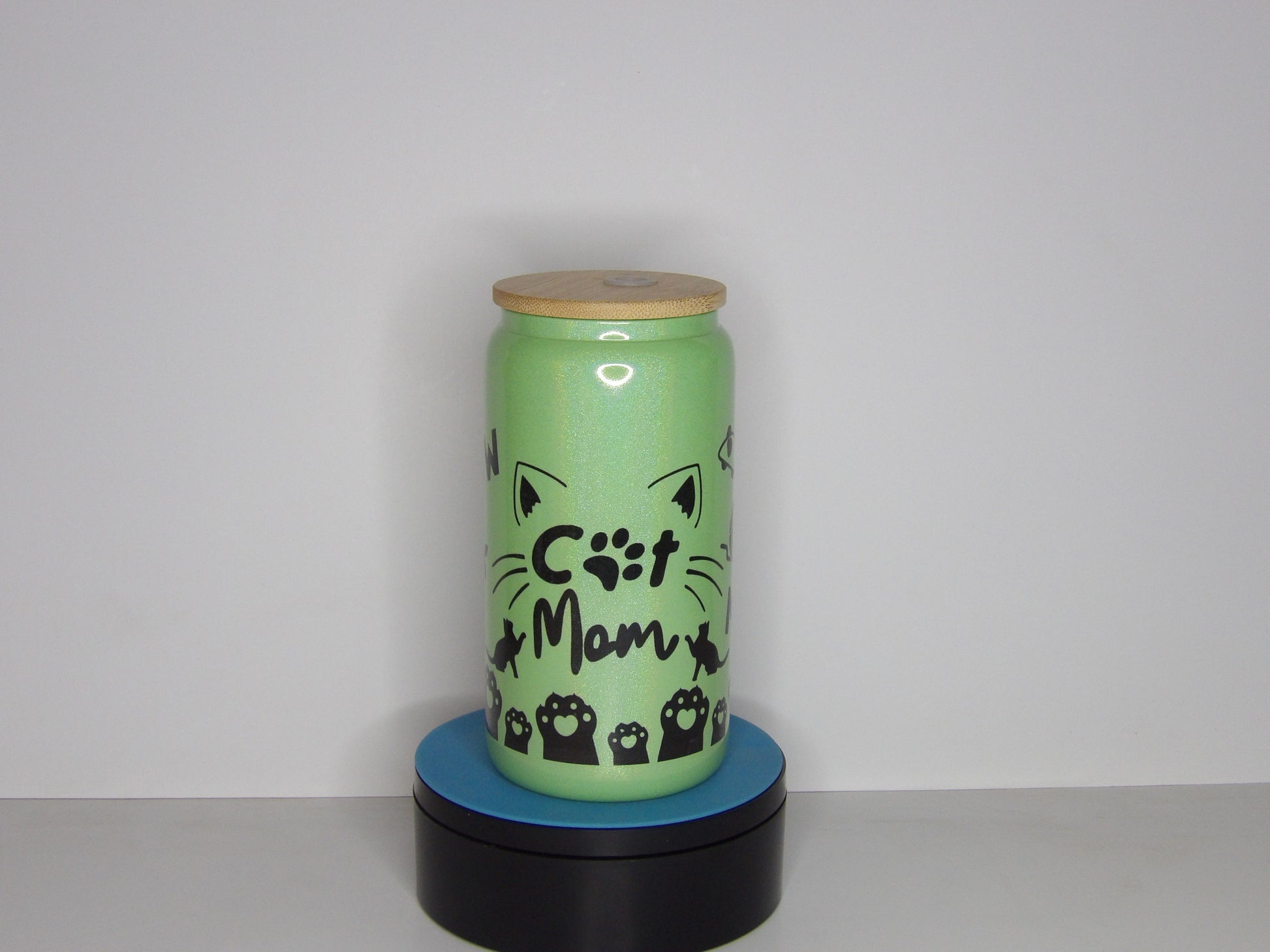 Purr-fect for feline lovers, this 16 oz frosted glass can is a must-have for every proud Cat Mom! Featuring playful black cat-themed graphics like paw prints, yarn, fish bones, and the word “Meow” on a sparkling mint green background, it’s both adorable and functional.