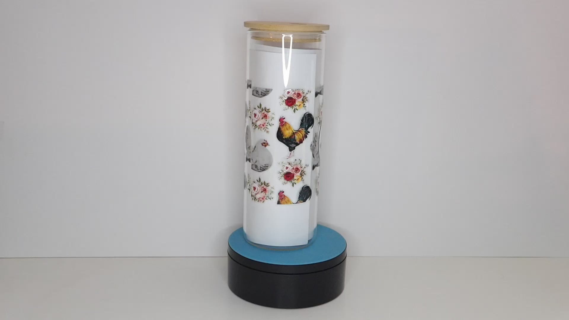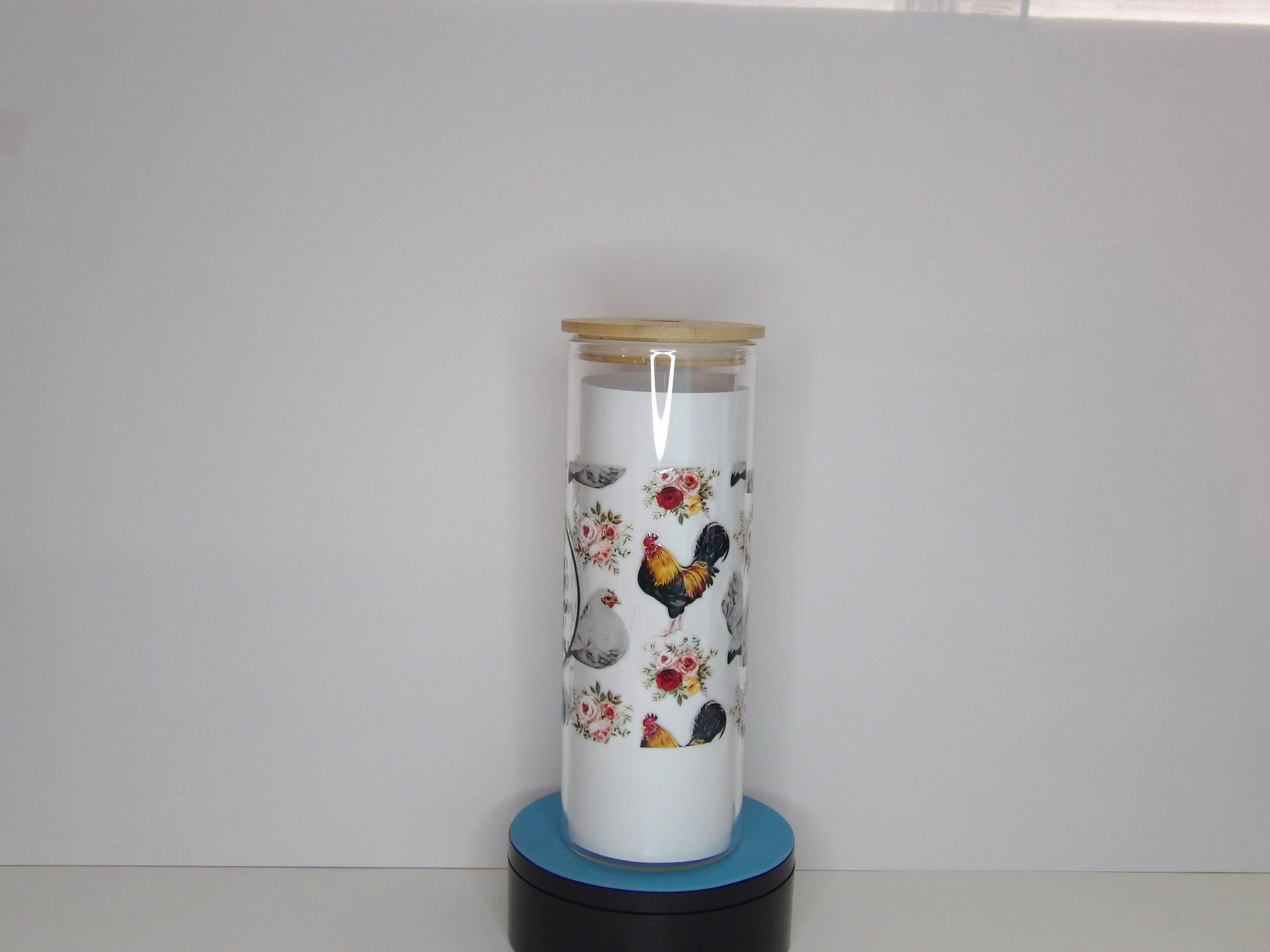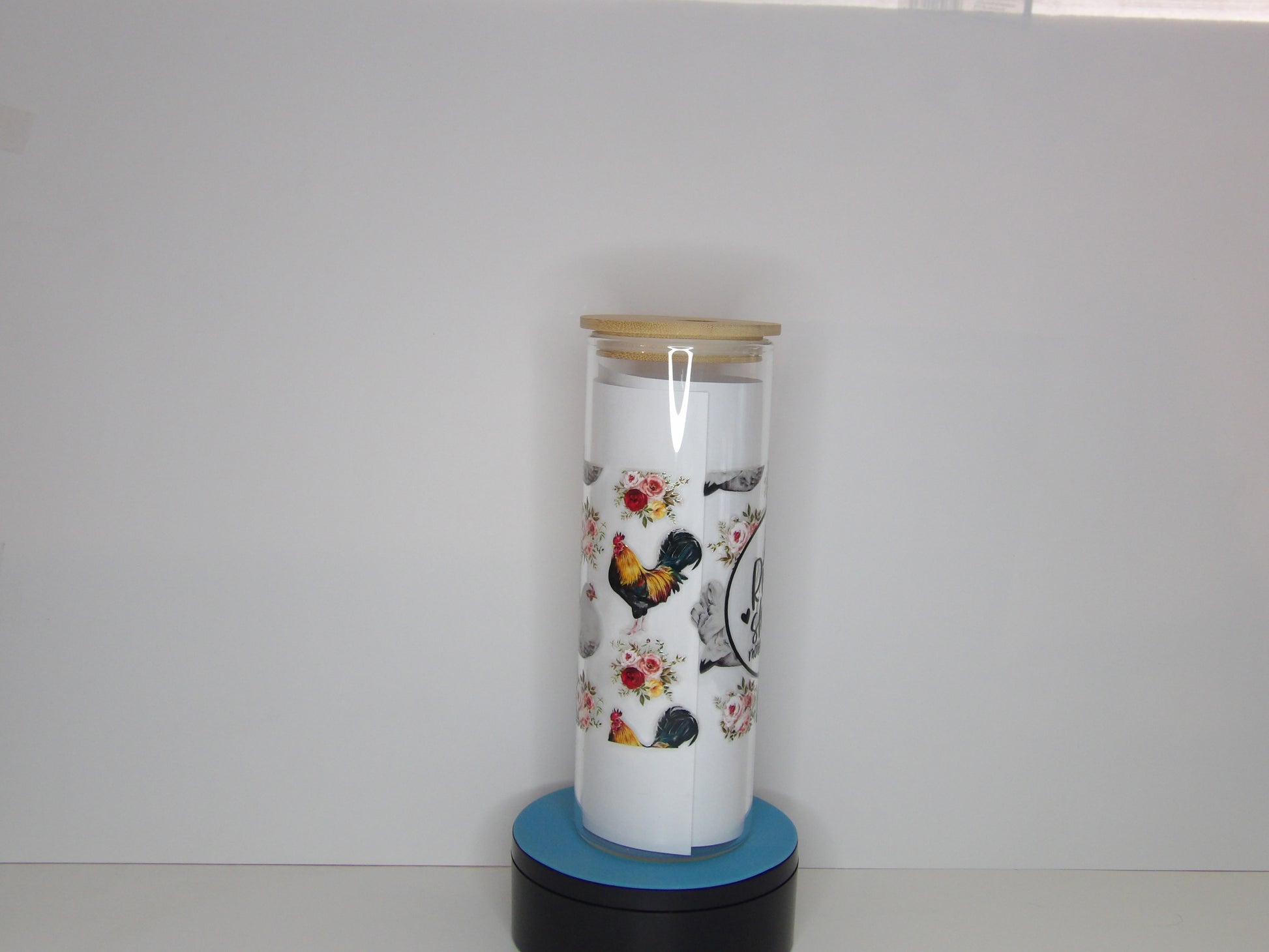 Add a bold touch of farmhouse charm to your kitchen with our 25oz “Rise & Shine Mother Cluckers” glass tumbler. Featuring vibrant rooster and floral designs with a fun and cheeky message, this stylish container is perfect for storing coffee, tea, sugar, or snacks. Made from durable glass with a natural bamboo lid, it keeps your contents fresh while adding personality to your table or desk.