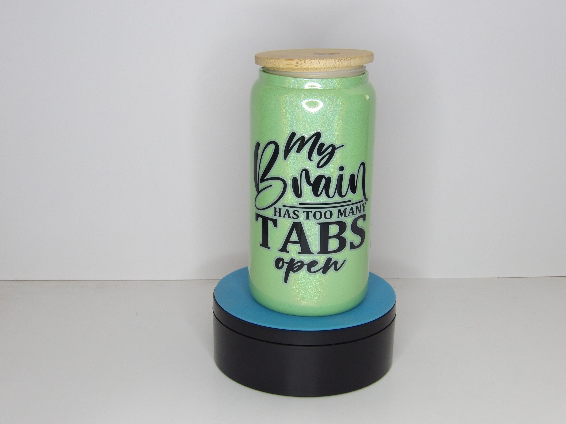 This 16oz green shimmer glass can is perfect for anyone whose brain has “too many tabs open.” One side features a whimsical Highland cow surrounded by bright sunflowers, while the other side reads the relatable phrase "My Brain Has Too Many Tabs Open" in bold black lettering. Includes a bamboo lid and reusable glass straw. Handmade in the USA—minor imperfections may be present due to the handcrafted nature.