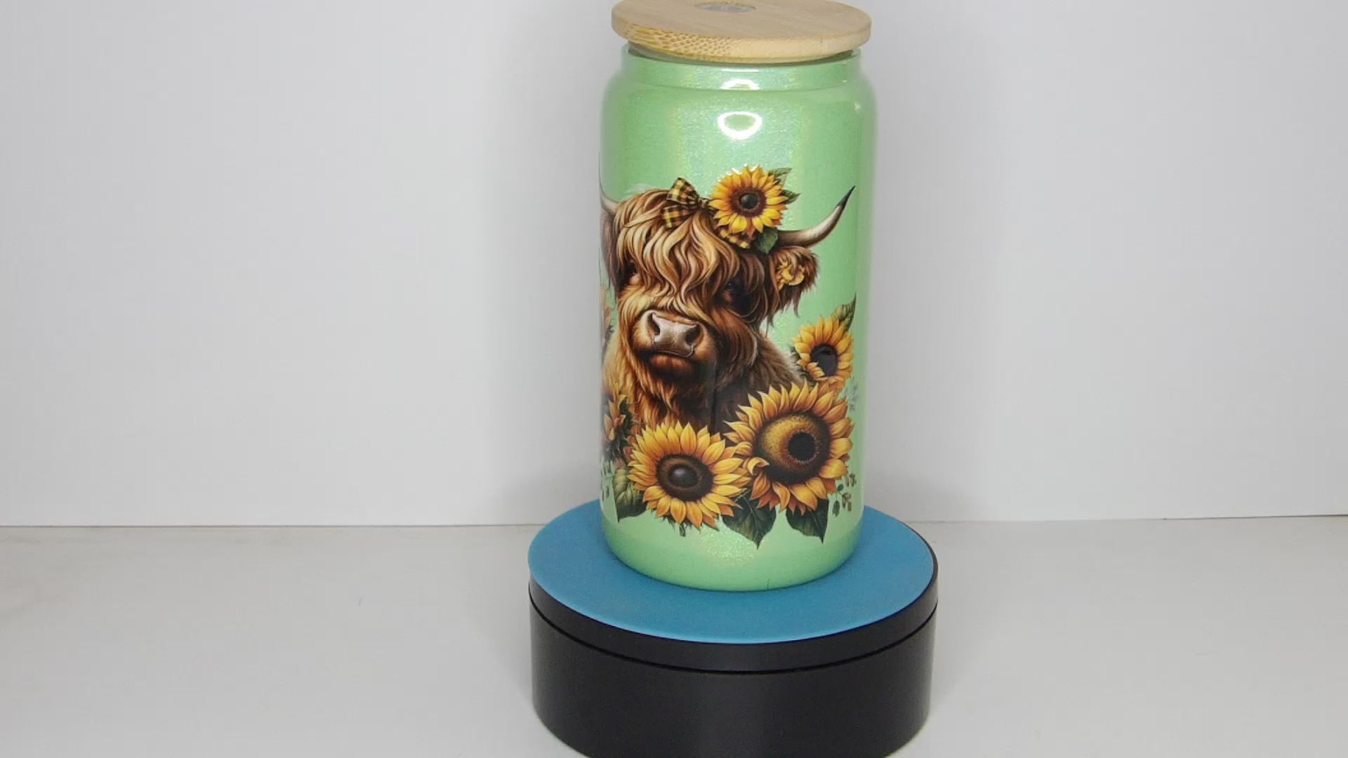SEO Keywords: Highland cow glass can, funny glass tumbler, sunflower cow cup, 16oz green shimmer glass, too many tabs open cup, handmade USA drinkware