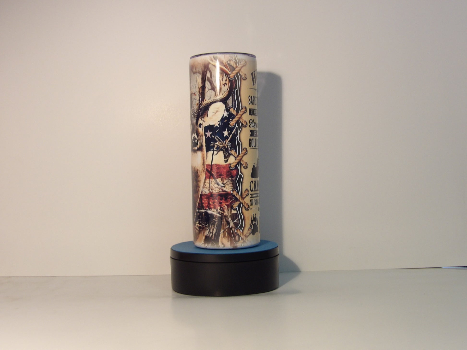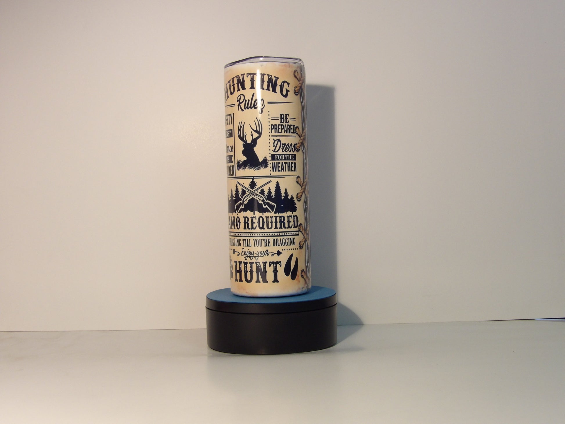 Perfect for hunters and outdoor lovers, this 20oz tumbler features bold "Hunting Rules" text, a majestic buck, rustic antler accents, and a distressed American flag design. Made of durable stainless steel with double-wall insulation, it keeps drinks hot or cold for hours. Includes a secure lid and reusable straw. Great for use at camp, in the woods, or on the road. Handwash only. Do not microwave.