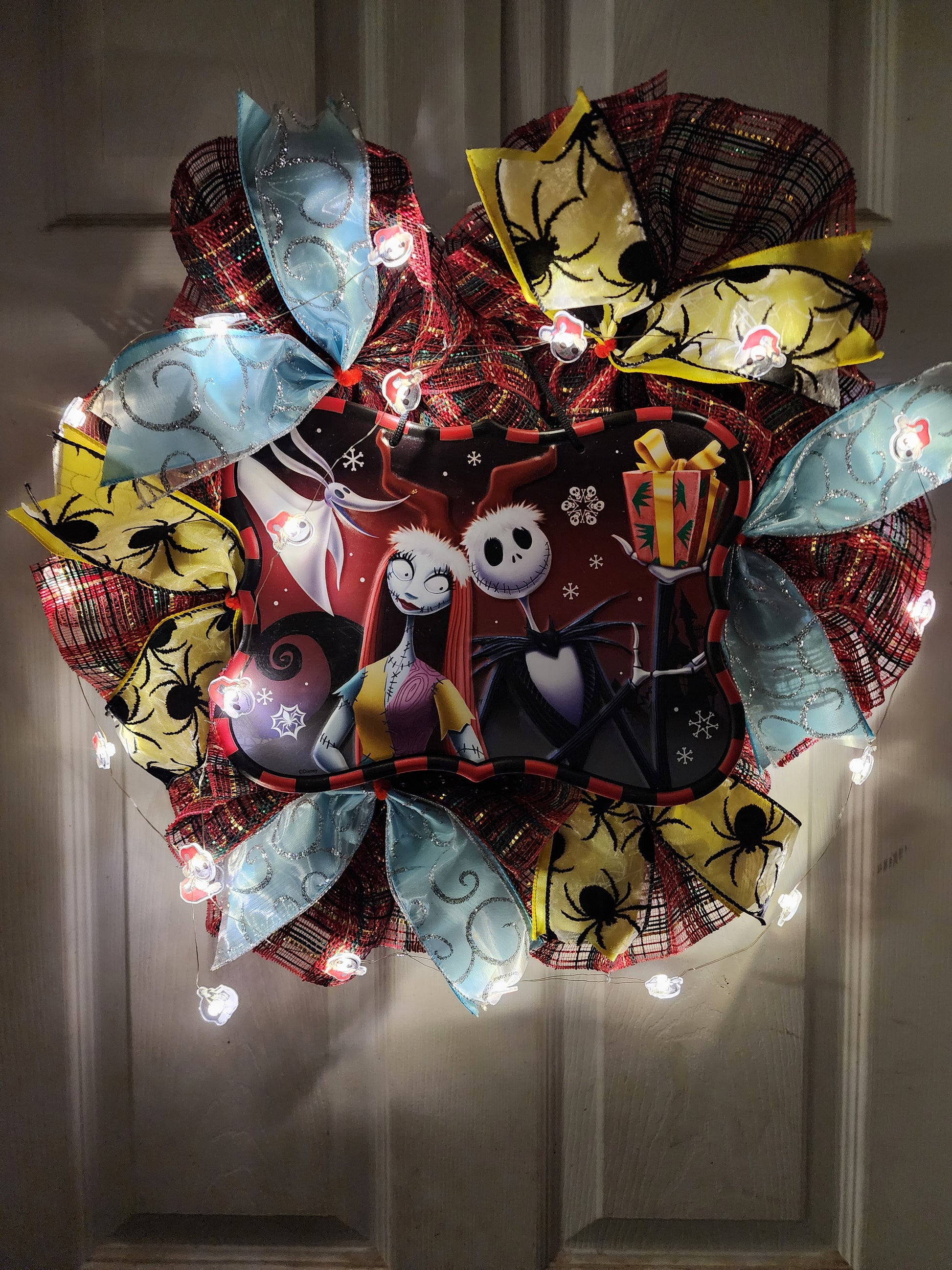Celebrate the days between Halloween and Christmas with this Smiling Jack and Ms. Sally. This wreath is geared more towards Christmas but does bring some Halloween in such as spiders and spider webs. Base of a red plaid deco mesh on a fourteen inch frame is surrounded by Smiling Jack lights.