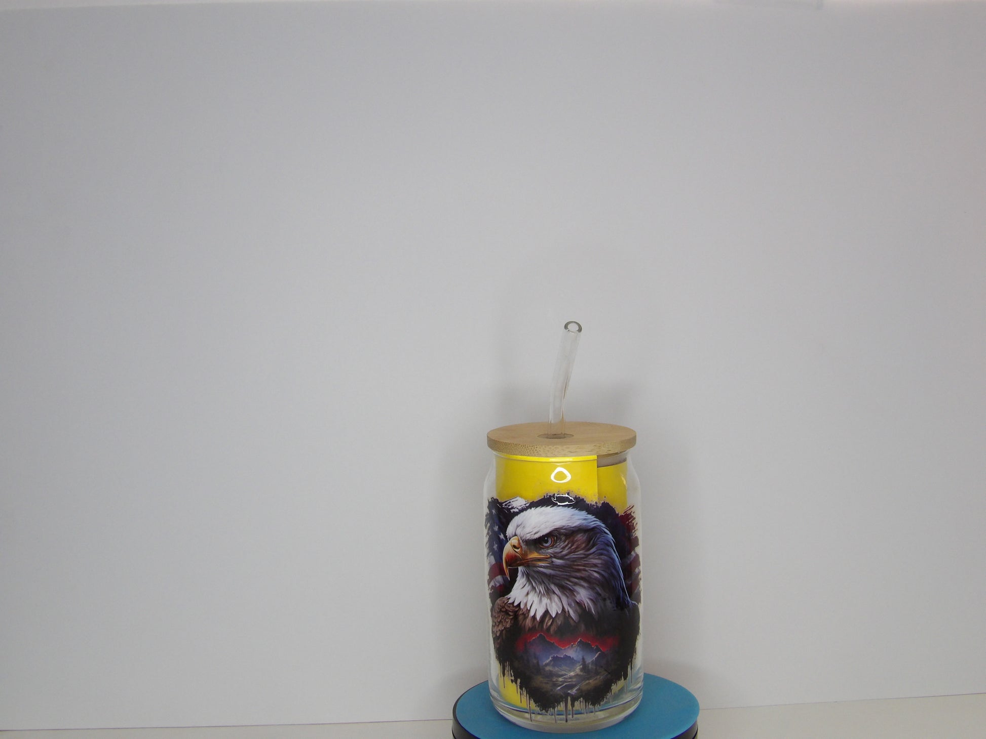 This high-quality glass tumbler is a perfect blend of patriotism and functionality. Featuring a bold and detailed design of a majestic bald eagle on one side, it symbolizes strength and freedom. The intricate artwork is paired with a sturdy bamboo lid and a clear glass straw for an eco-friendly touch.
