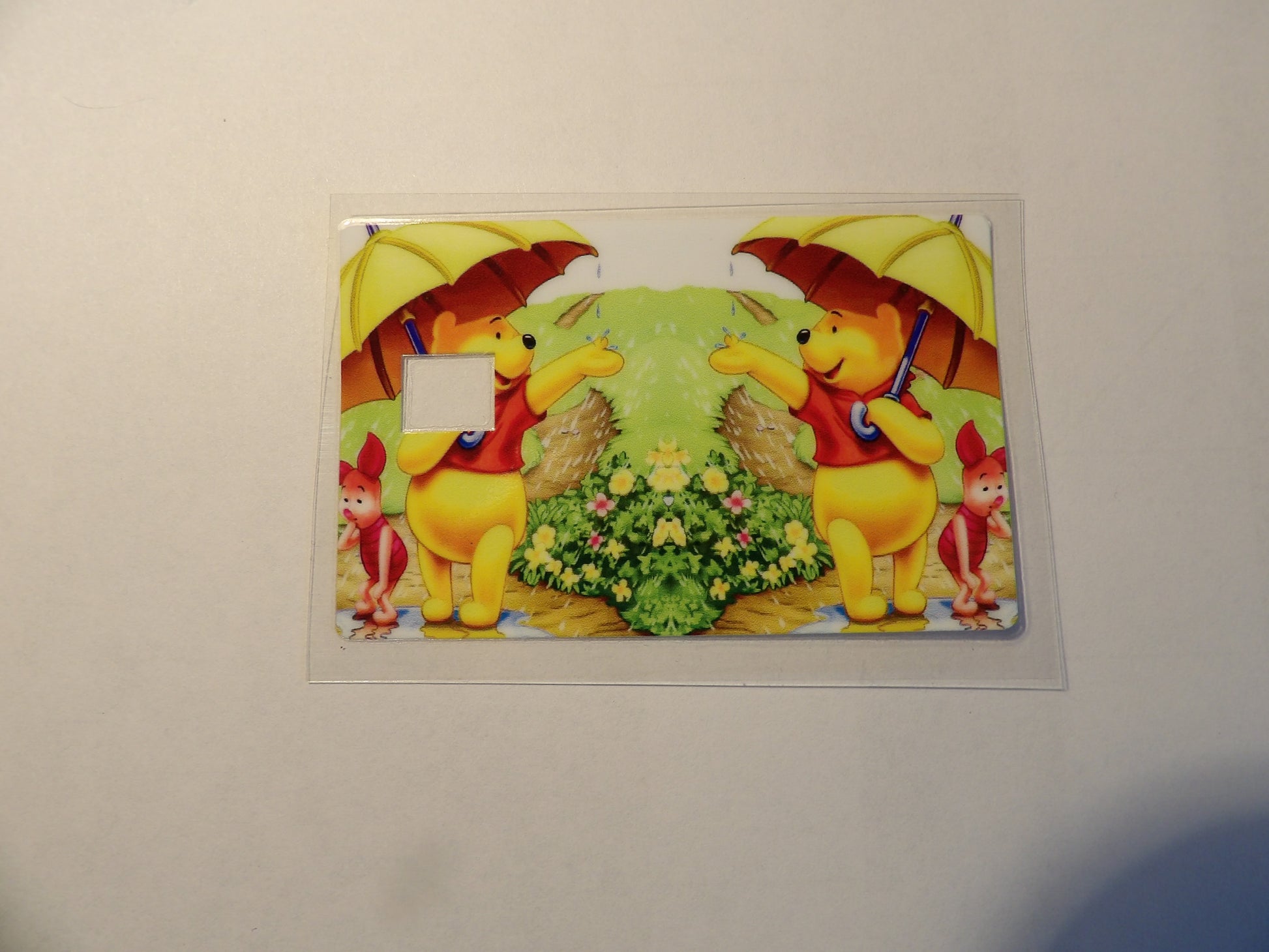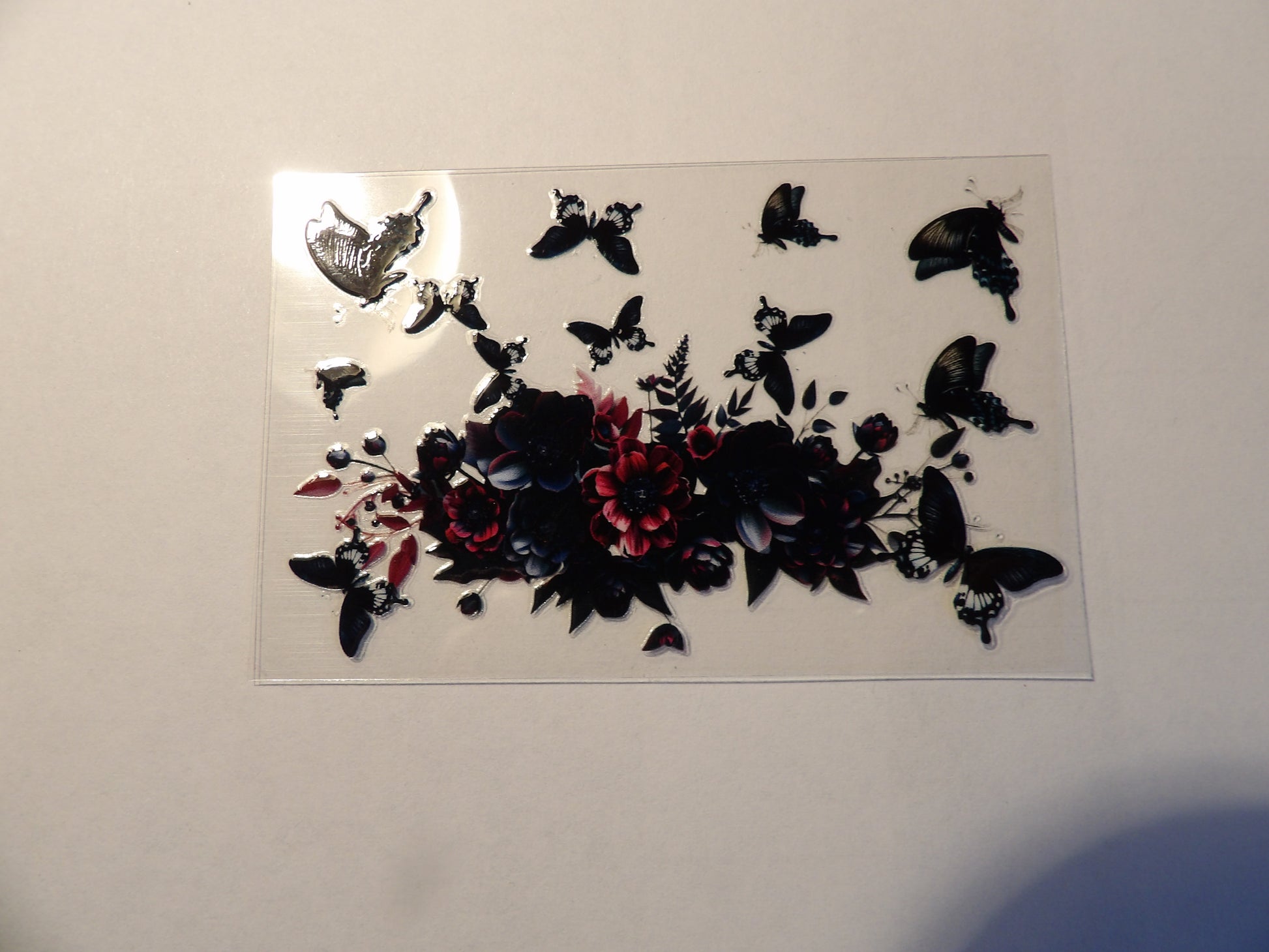 Align the design with the card edges and apply slowly, pressing from one end to the other to avoid bubbles.