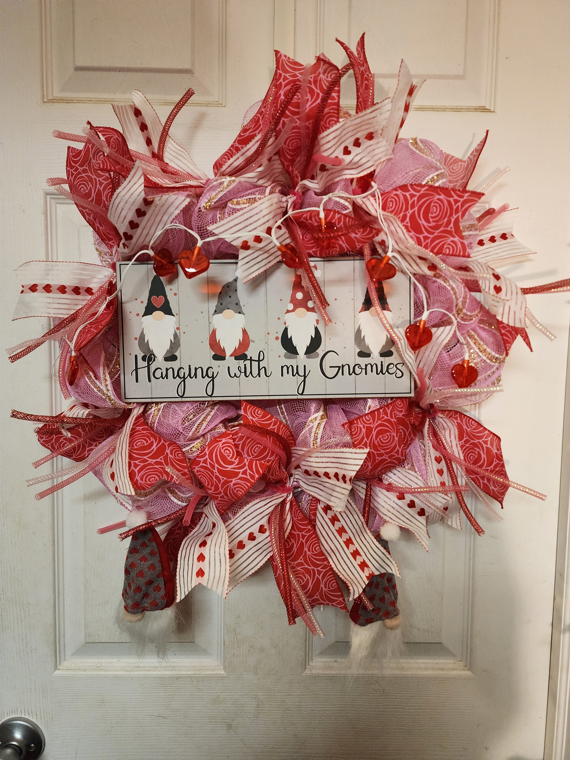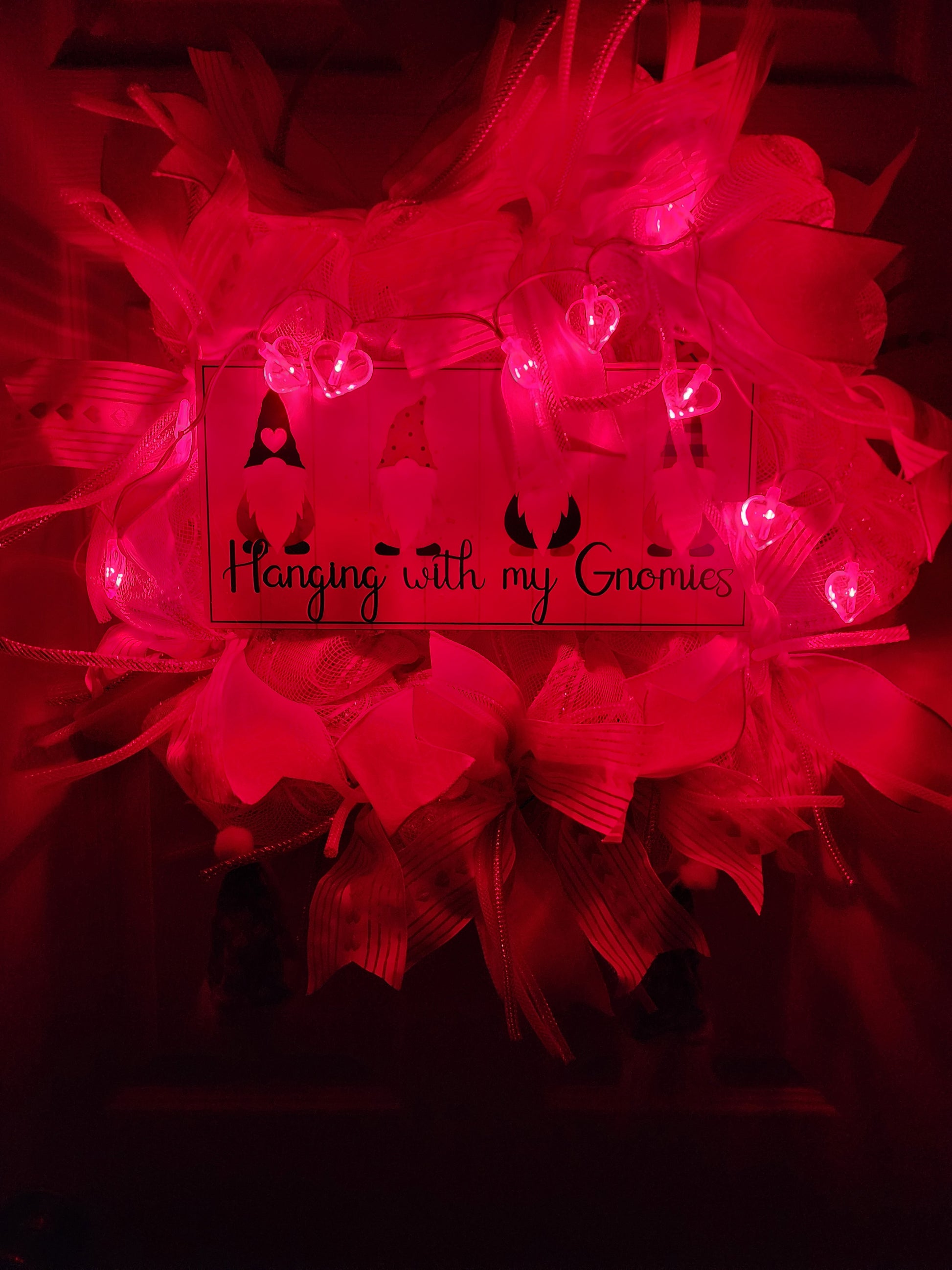 Gnome lovers here is a Valentines Day wreath for you. The poofs of a beautiful light pink with gold threads is the base of this wreath. Along the outside are bundles of white with red hearts and rose ribbons with a red, dark pink, and light pink deco mesh tubing. Around the top part of the wreath are red heart lights that are powdered by two AA batteries. Hanging from the bottom are two gnomes with hearts on their hats.