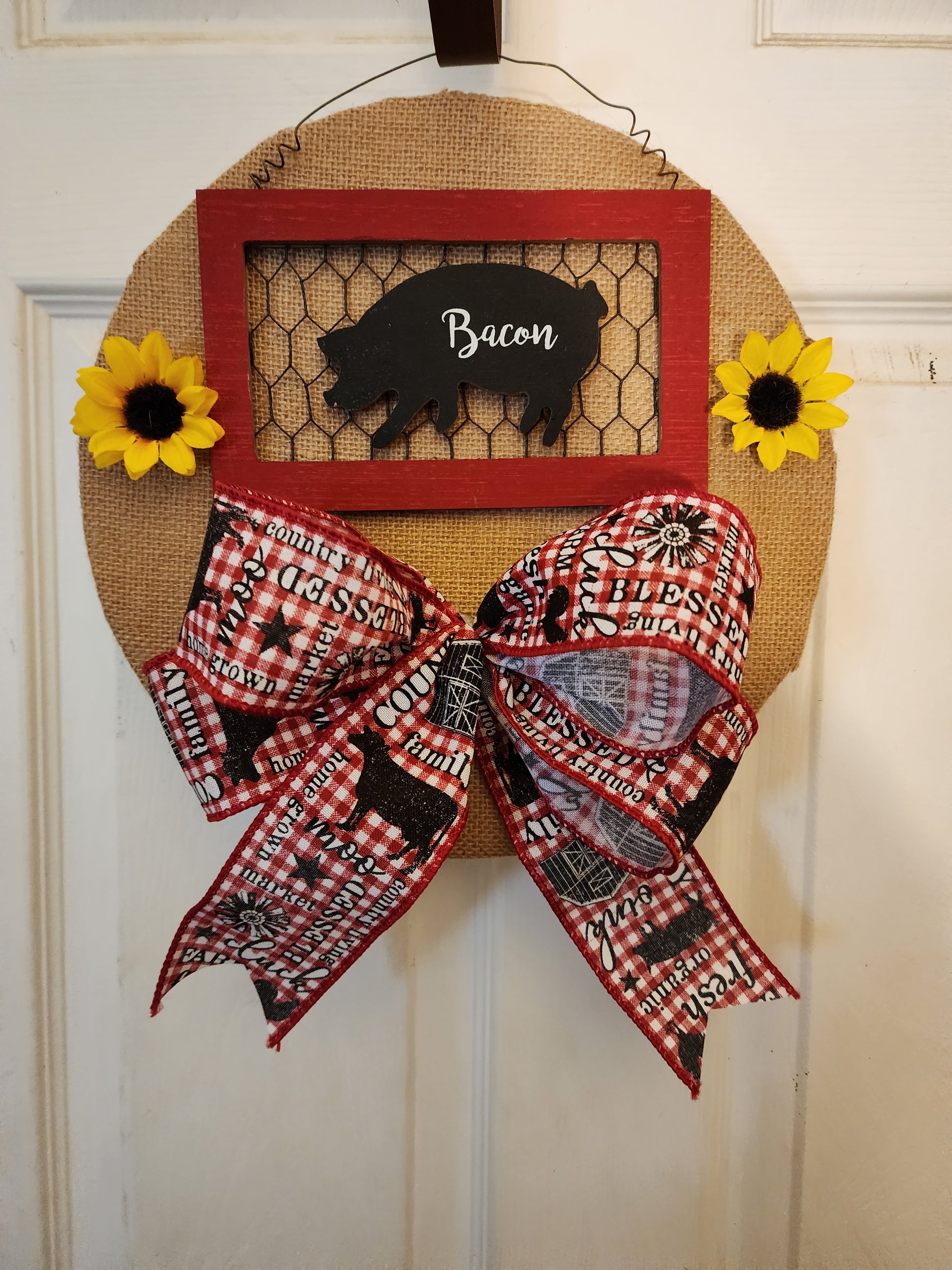 This wooden twelve inch sign is covered by burlap and topped with a section of a wooden rectangle painted red with a look of chicken wire before a cut out of a pig. On the pig is the word bacon. On each side of the pig are two small sunflowers. At the bottom is a bow of red background that has different farm animals and other farm words.