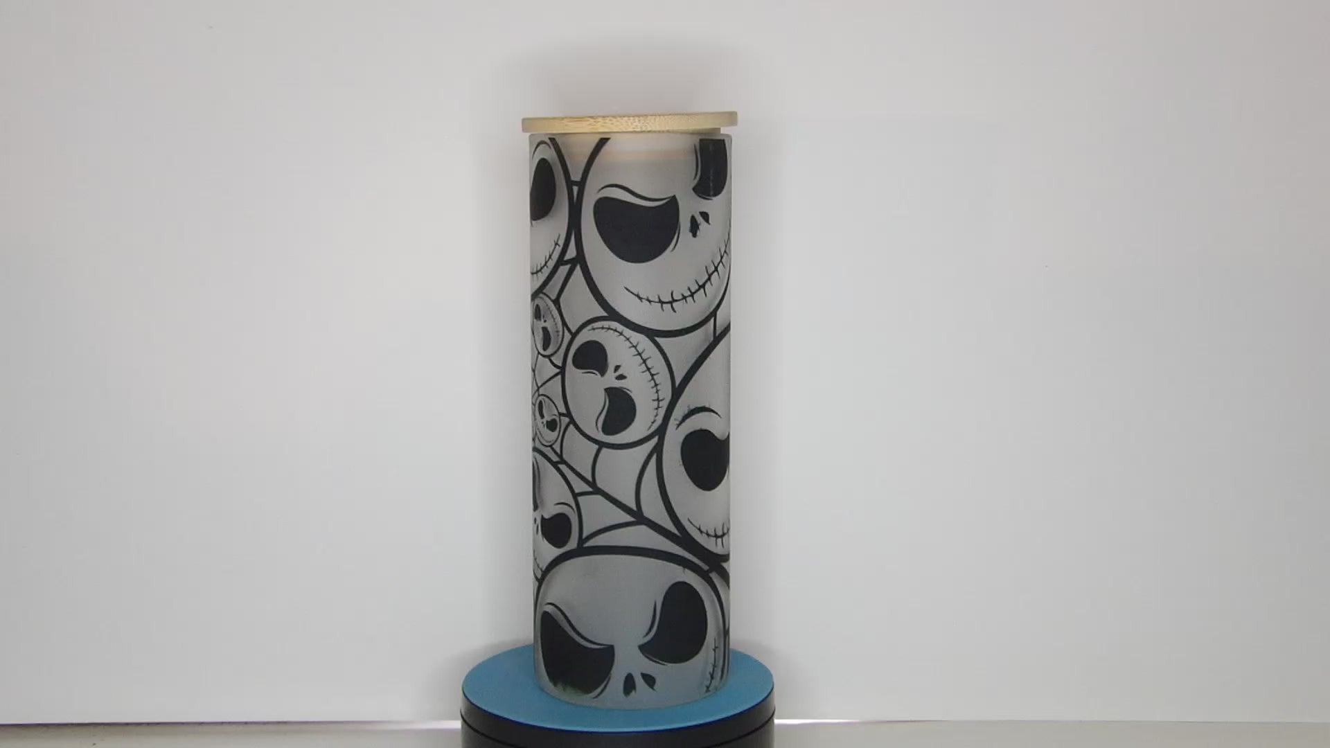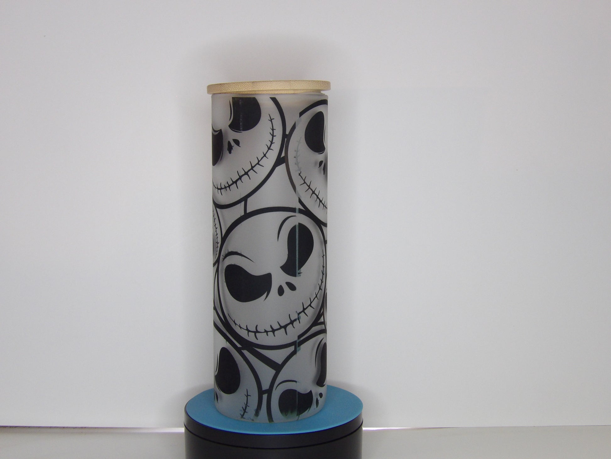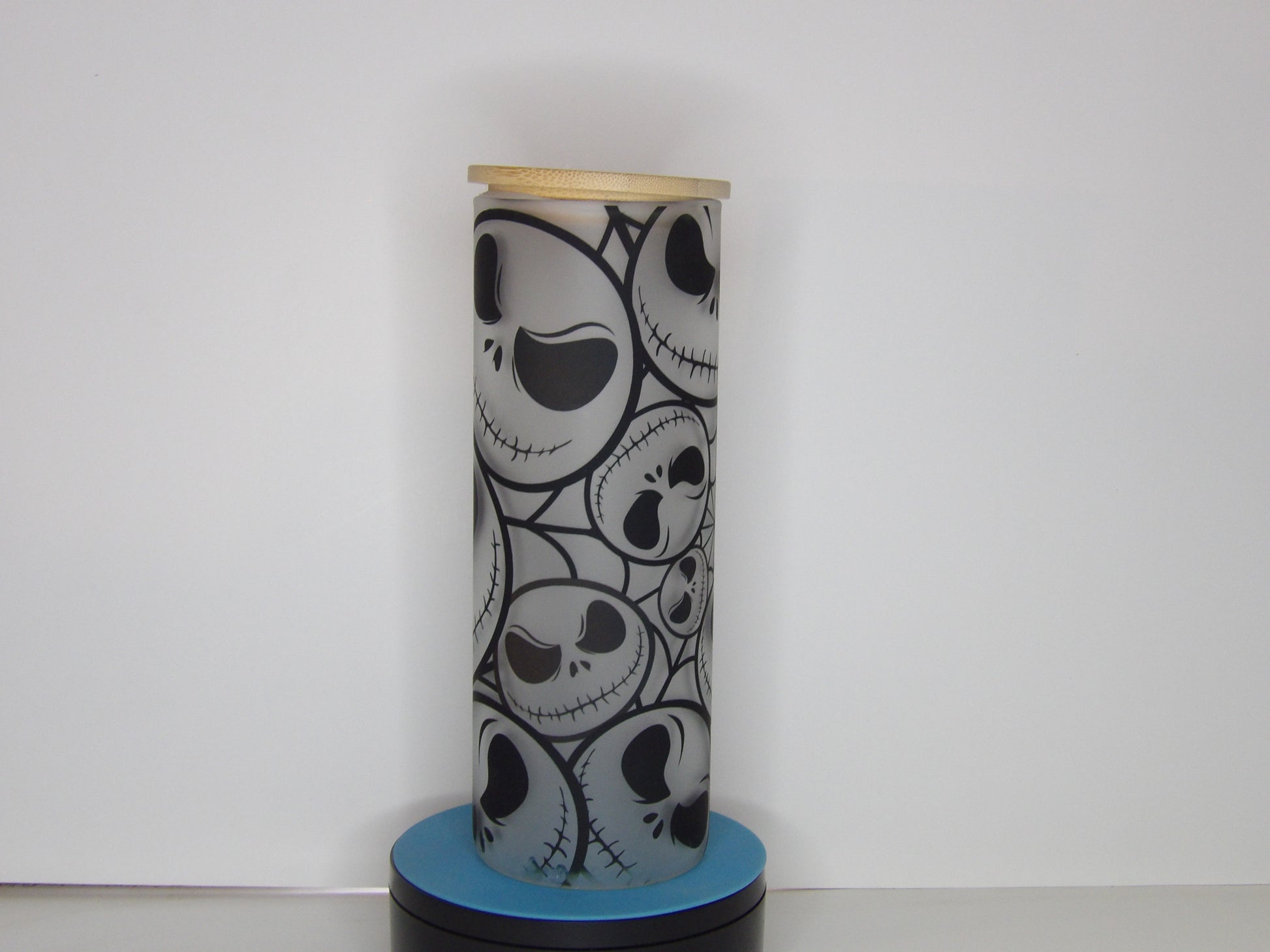 Sip in spooky style with this 25 oz clear glass tumbler, featuring a bold black-and-white Jack-inspired design that's perfect for Halloween lovers and fans of gothic themes. Made from durable glass, this large-capacity tumbler is ideal for your favorite iced coffee, tea, water, or cold beverages.