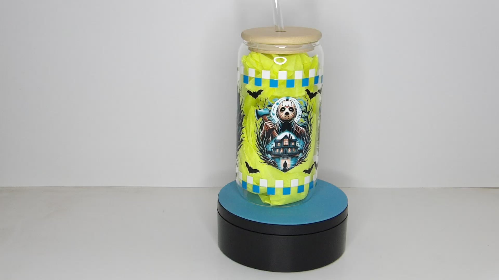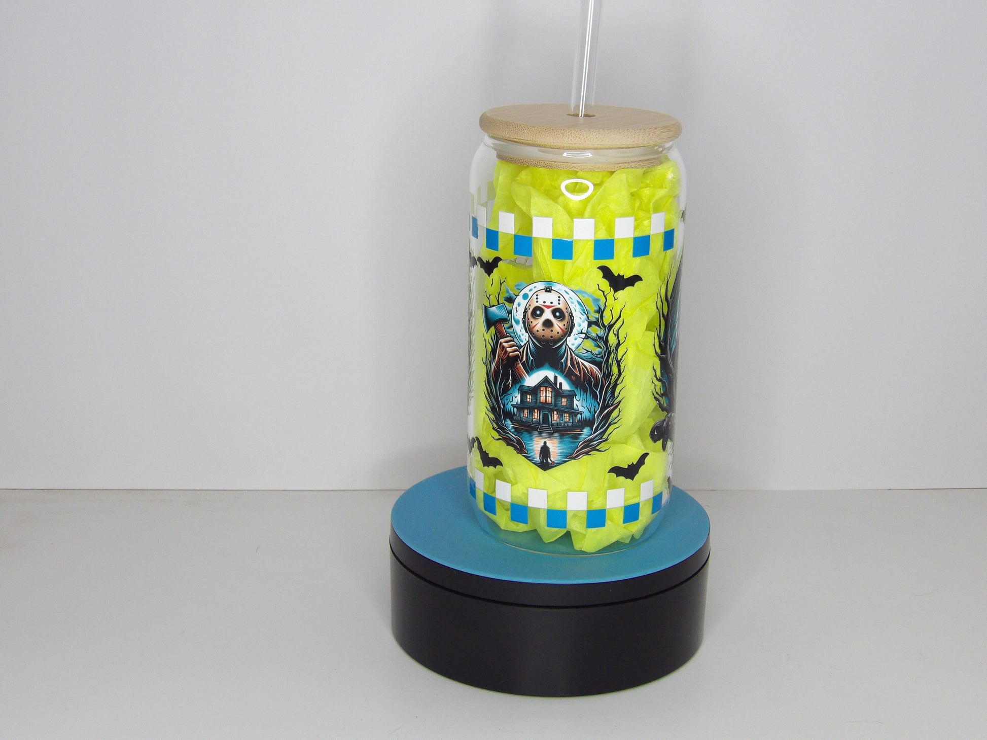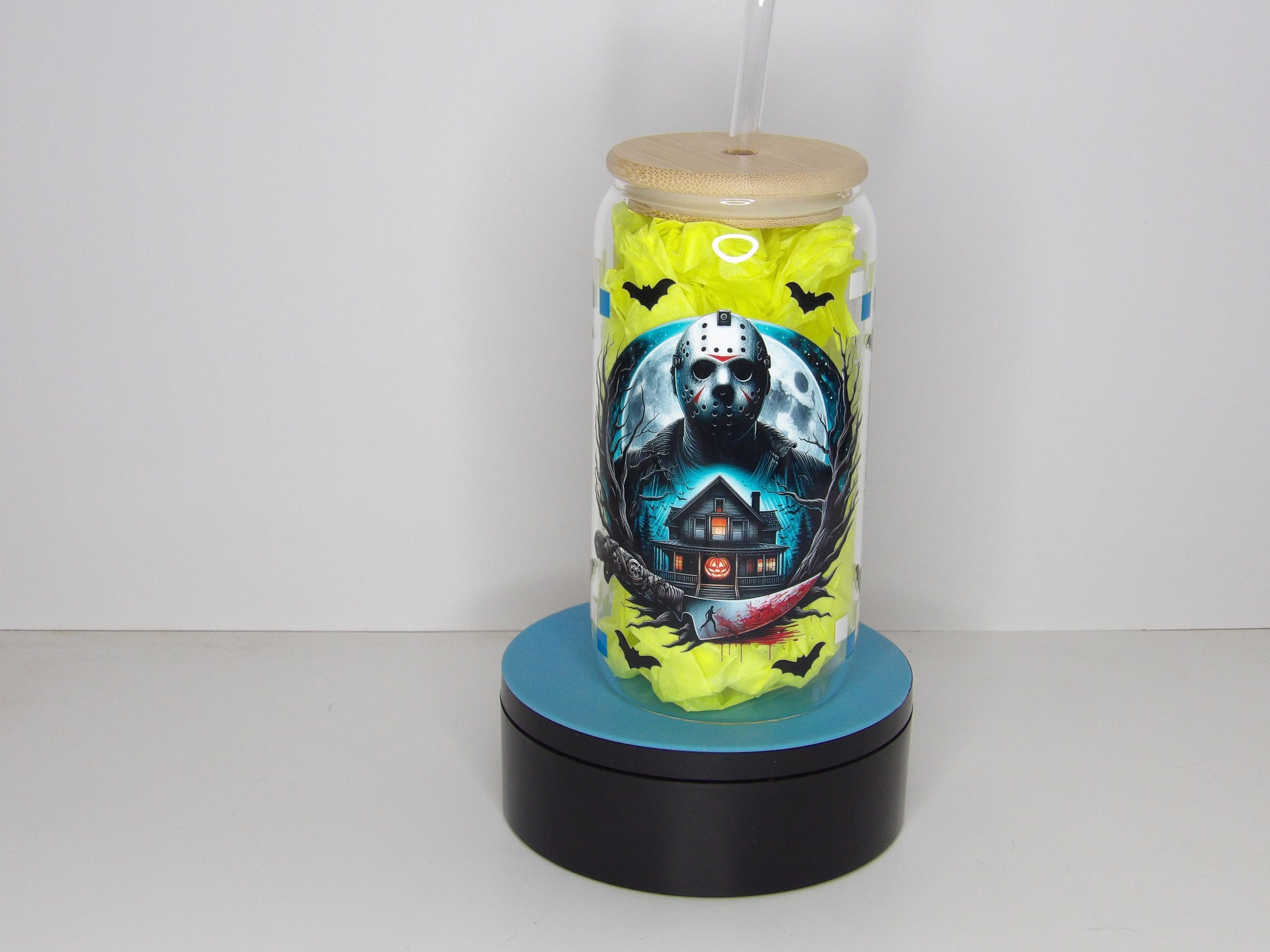SEO Keywords: horror glass can, clear glass iced coffee tumbler, 16oz Halloween drinkware, reusable bamboo lid cup, spooky glass cup with straw, handmade horror tumbler USA
