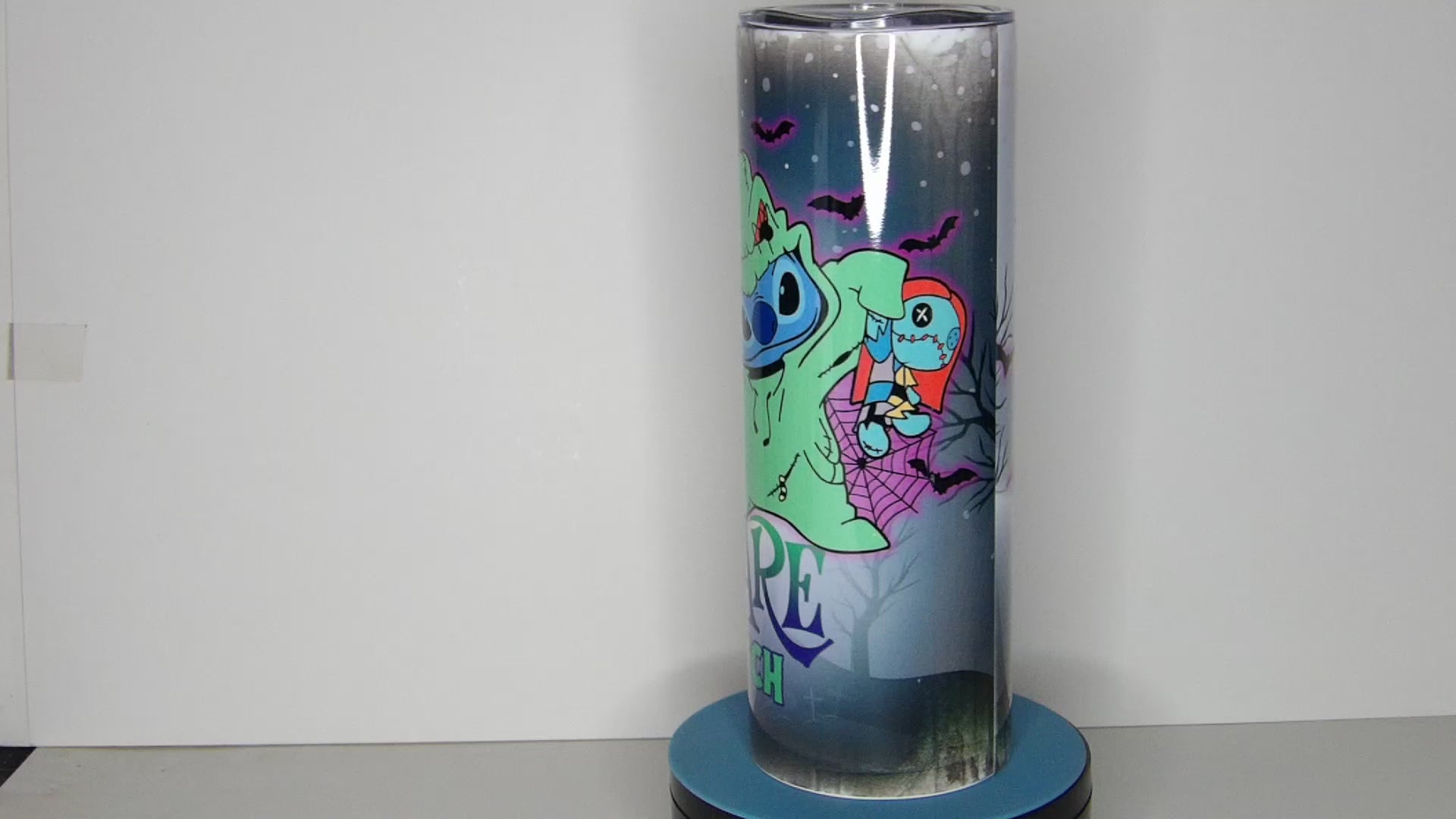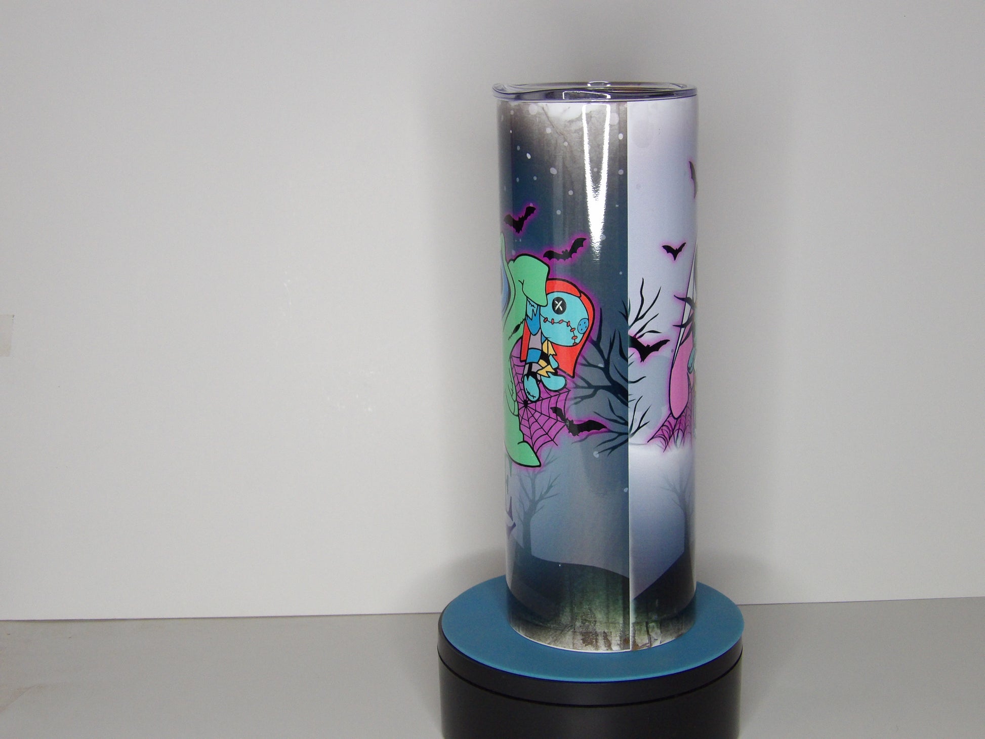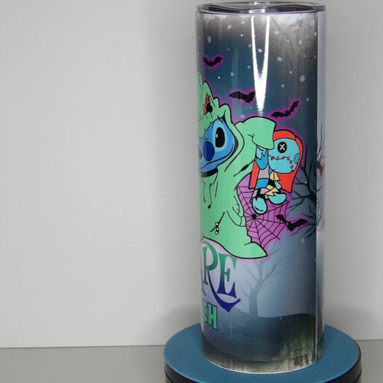 Bring spooky season fun to your daily routine with this eye-catching Nightmare Stitch 20oz tumbler! Featuring Stitch dressed in haunting Halloween gear with eerie bats and cobwebs in the background, this tumbler is a must-have for fans of frightfully cute designs. Perfect for coffee, tea, or iced drinks on the go, it's both stylish and functional.