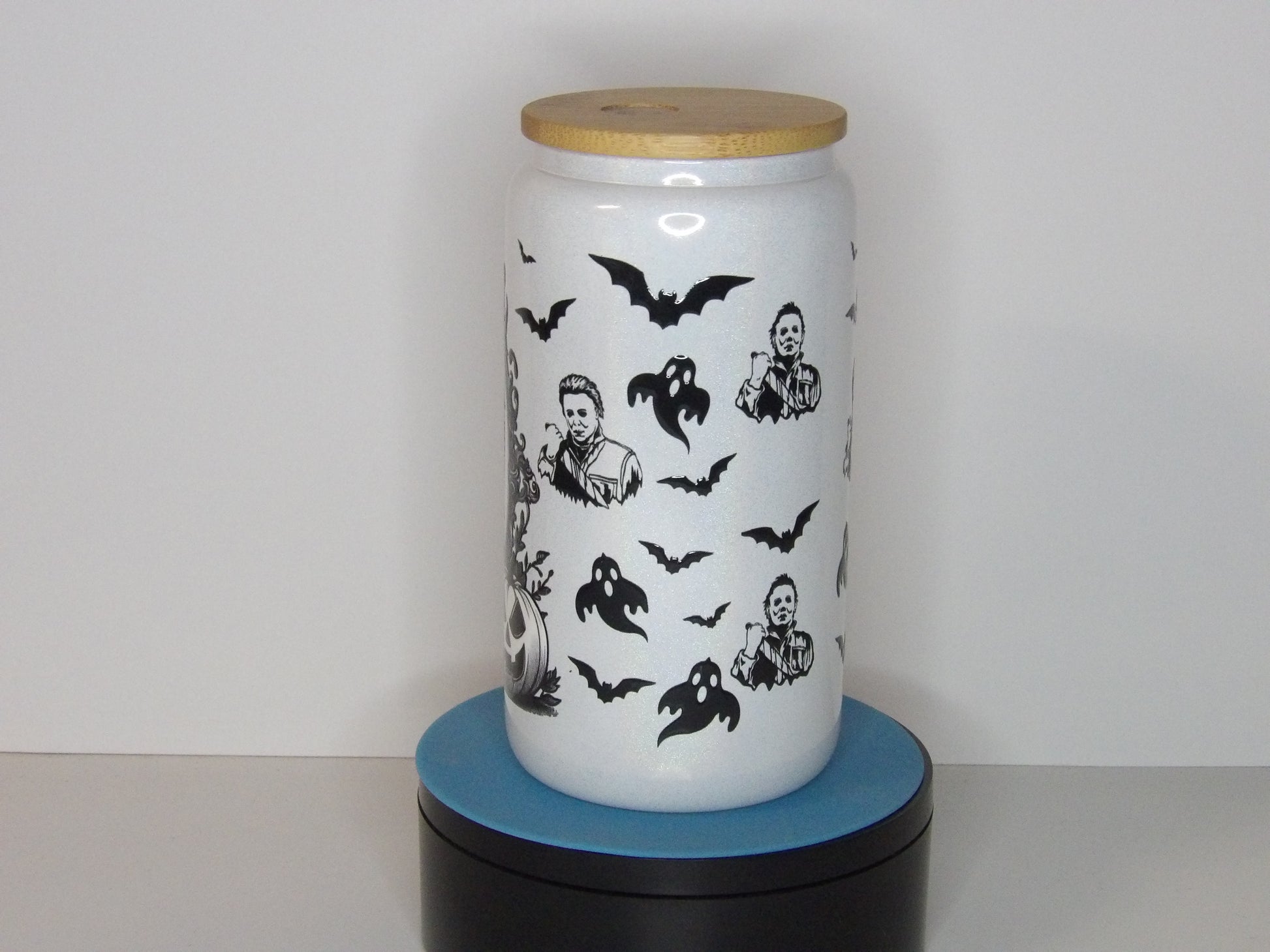 Yellow 37-Michael Myers 16 oz White Shimmer Glass Can Tumbler