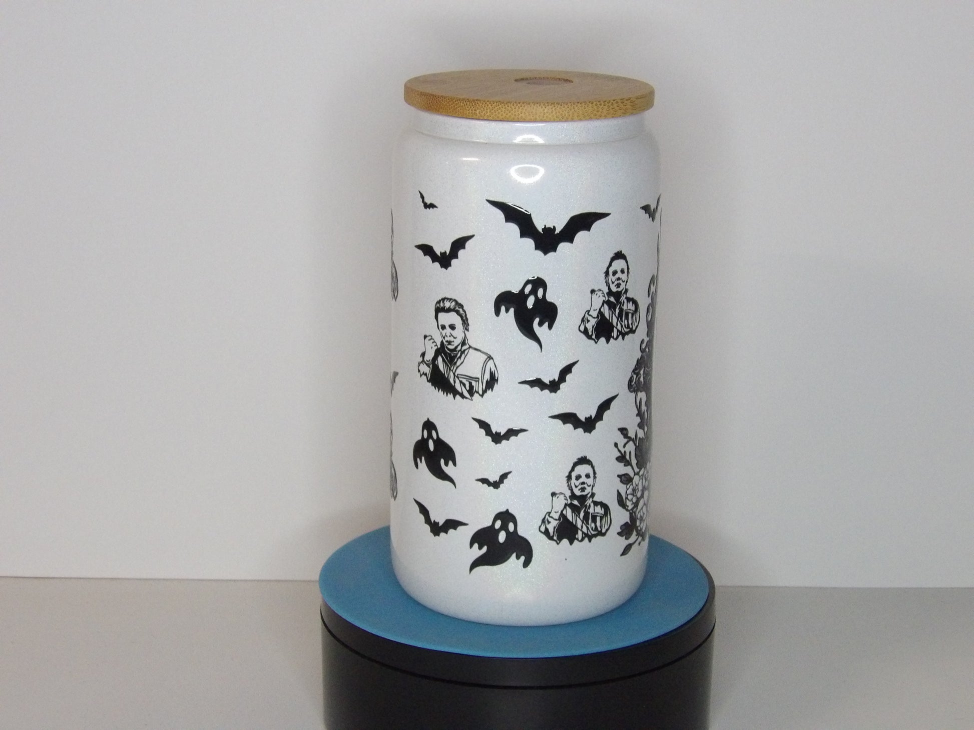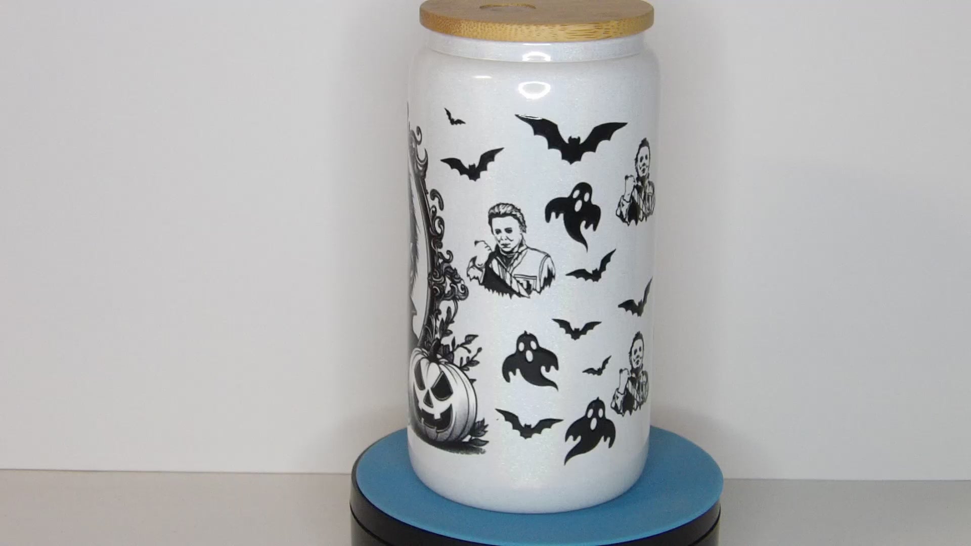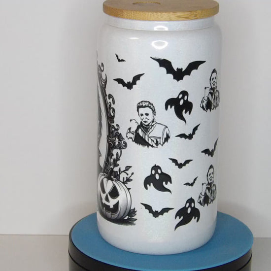 Channel spooky vibes year-round with this hauntingly cool 16 oz Michael Myers shimmer glass can tumbler! Featuring a high-contrast black-and-white design of the iconic horror legend surrounded by creepy bats, pumpkins, and ghostly details, this glass is the perfect blend of scary and stylish. The subtle white shimmer finish gives it an eerie yet elegant touch that’s great for horror fans and Halloween lovers alike.